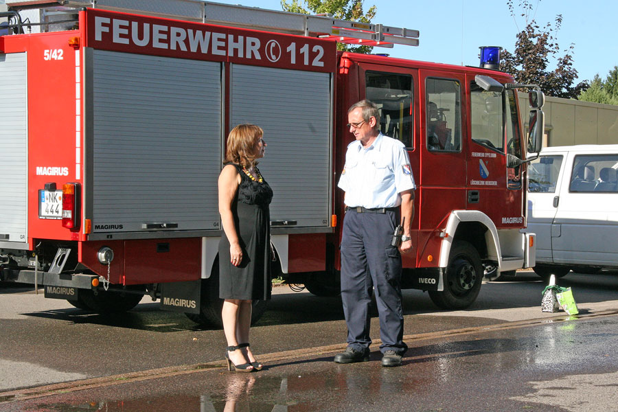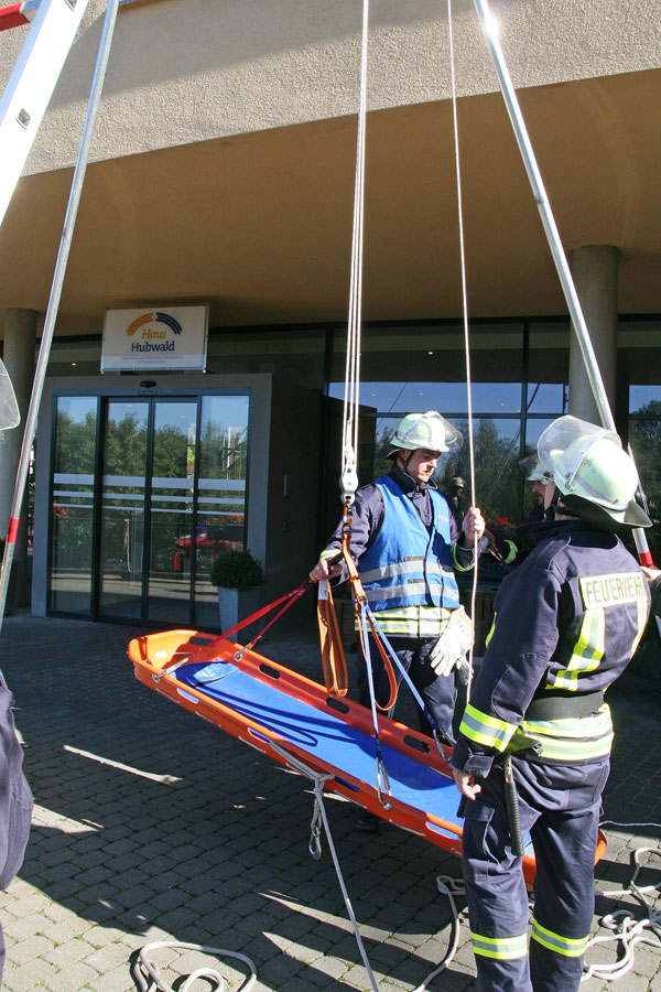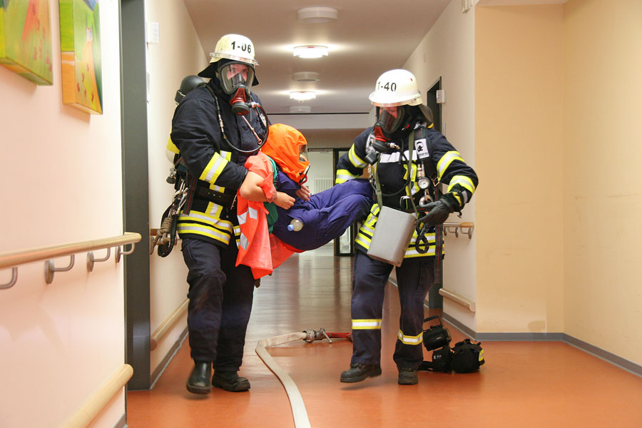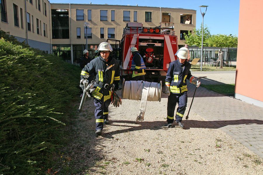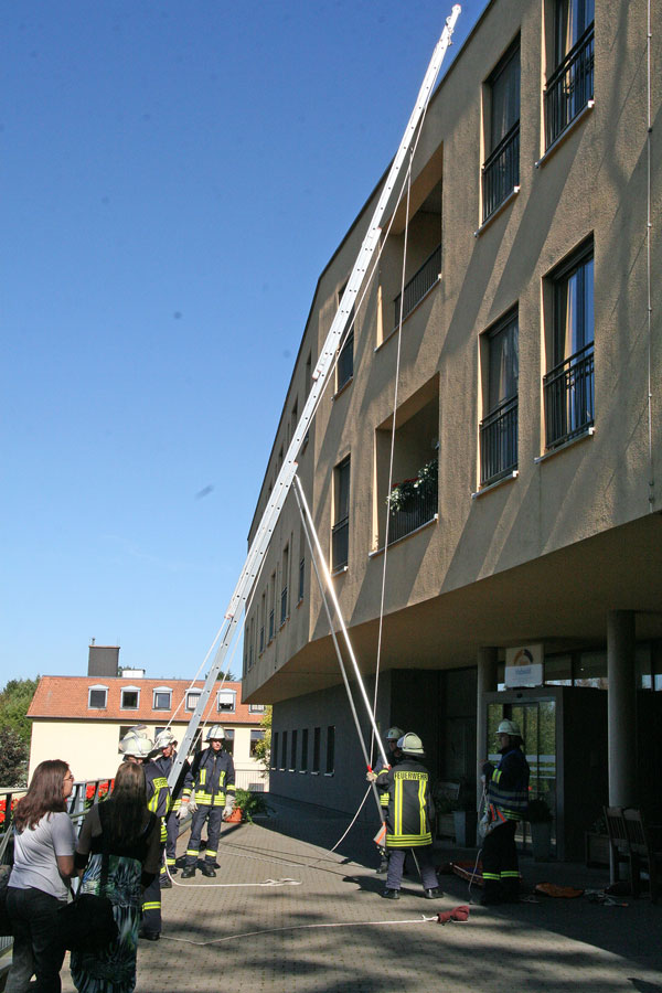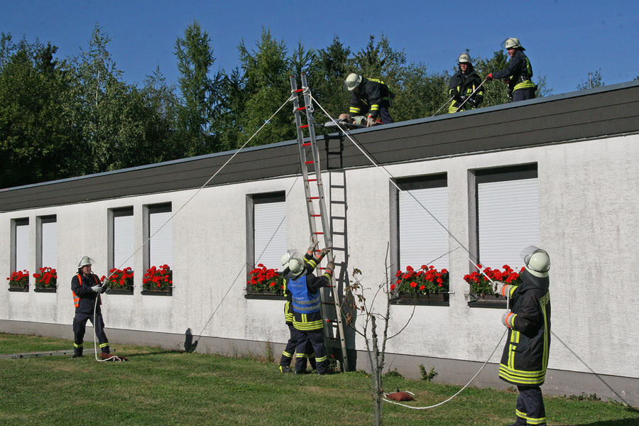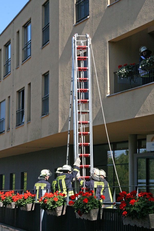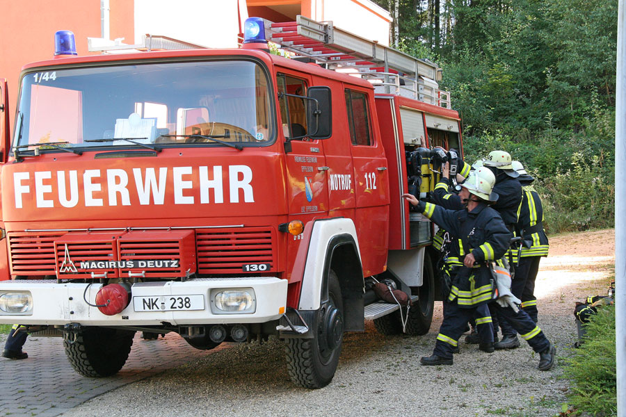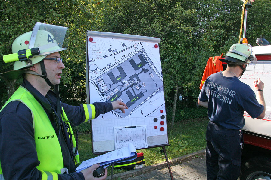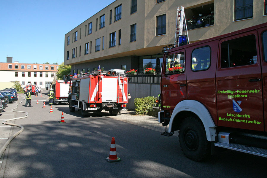 Für die Bewohnerinnen und Bewohner des psychiatrischen Pflegeheims in Habach war es eine willkommene Abwechslung an diesem sonnigen Samstag Nachmittag: Nachdem von der Leitstelle Alarm ausgelöst worden war, rückten in kurzen Abständen Einsatzkräfte aus allen Löschbezirken der Gemeinde Eppelborn mit Blaulicht und Martinshorn zur diesjährigen Jahresabschlussübung an. Ein Waldbrand im rückwärtigen Bereich der Wohngebäude sollte bekämpft werden, lautet die Aufgabe für einen Teil der angerückten Mannschaft. Funkenflug und eine starke Rauchentwicklung erschwerten die Aufgabe. Während mit mehreren Rohren der Löschangriff vorgenommen wurde, mussten mehrere verletzten Personen aus dem verrauchten Gebäude gerettet werden. Mit Atemschutzgeräten ausgerüstet, drangen mehrere Trupps in das Gebäude vor und suchten die Räumlichkeiten ab. Mehrere Personen, alle gemimt von Statisten der Jugendfeuerwehr, mussten mit Fluchthauben aus dem Gefahrenbereich gerettet werden. [left][cmsimg]4586[/cmsimg][/left] Eine weitere Person galt es, vom Dach eines der eingeschossigen Gebäude mit einem Leiterhebel zu retten. Gleichzeitig musste eine Wasserversorgung vom Löschteich bis zur Einsatzstelle aufgebaut werden. Die ganzen Aufgaben, die schnellstens und zum Teil parallel bewältigt werden mussten, wurden von Einsatzleiter Frank Kartes vom Einsatzleitwagen koordiniert. Auch die "Projektgruppe Absturzsicherung" demonstrierte ihren Ausbildungsstand bei der Rettung einer Person aus dem 1. Obergeschoss des Hauptgebäudes. Diese sollte mit einer Schleifkorbtrage über den Balkon gerettet werden. Bevor die Trage hochgezogen werden konnte, musste die große Schiebleiter in Stellung gebracht werden. Beim Aufbau mit Leinen und Karabinern musste jeder Handgriff sitzen. Die neue Bürgermeisterin Birgit Müller-Closset konnte sich erstmals als Chefin der Wehr einen Überblick über das Leistungsspektrum ihrer Feuerwehr verschaffen. Wehrführer Hermann Josef Recktenwald führte sie zusammen mit den Ortsvorstehern der Gemeinde, dem Kreisbrandinspekteur Werner Thom und dem Landesbrandinspekteur a.D. Hans-Jürgen Olliger, die als Ehrengäste die Übung verfolgten, zu den einzelnen Stationen und erklärte ausführlich die duchgeführten Tätigkeiten. [right][cmsimg]4606[/cmsimg][/right] "Für mich ist eine eine große Ehre, als neue Bürgermeisterin und Chefin der Wehr bei dieser Übung dabei zu sein", erklärte Birgit Müller-Closset bei der Nachbesprechung im Habacher Bürgerhaus. Eine Einsatzbereitschaft 24 Stunden pro Tag an 365 Tagen im Jahr sei für ein Ehrenamt eine großartige Leistung. "Ich sehe die Arbeit der Feuerwehr als sehr entscheidend an und werde Sie darin unterstützen", versprach die Bürgermeisterin. Auch Wehrführer Hermann Josef Recktenwald bedankte sich für den reibungslosen Einsatz der rund 100 Einsatzkräfte, die mit 15 Fahrzeugen angerückt waren. Lediglich im Bereich der Wasserversorgung aus dem Löschteich hätten sich Probleme gezeigt, die bei einer Begehung in der nächsten Woche angegangen werden. Das Pflegeheim in Habach mit seinen über 200 Bewohnern mit psychischen Behinderungen stellt im Einsatzfall eine besondere Herausforderung für die Feuerwehr dar. Nicht nur durch den weitläufigen Gebäudekomplex, sondern vor allem durch die besondere Betreuungsbedürftigkeit der Bewohner ist ein Einsatz aufwändig und personalintensiv. Regelmäßige Übungen an diesem Objekt dienen auch dazu, den Bewohnern die Angst vor der Feuerwehr zu nehmen. Zudem finden in regelmäßigen Abständen durch die Feuerwehr Brandschutzschulungen für die Pflegekräfte statt.