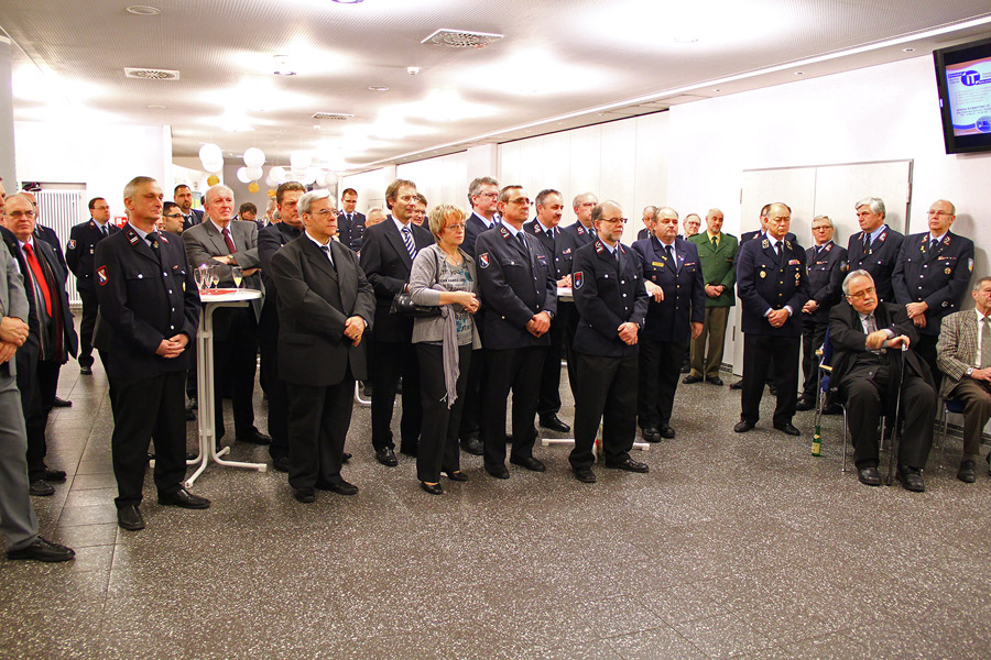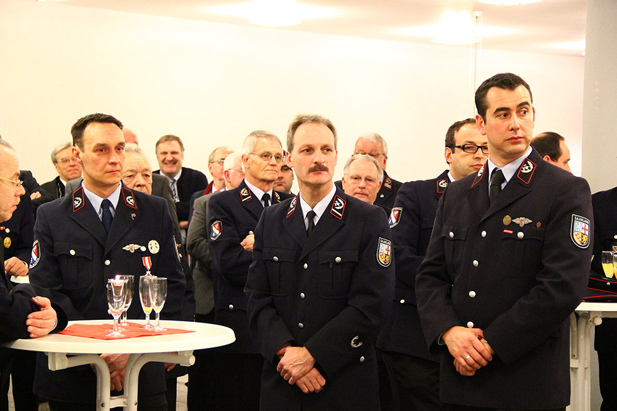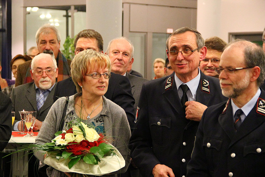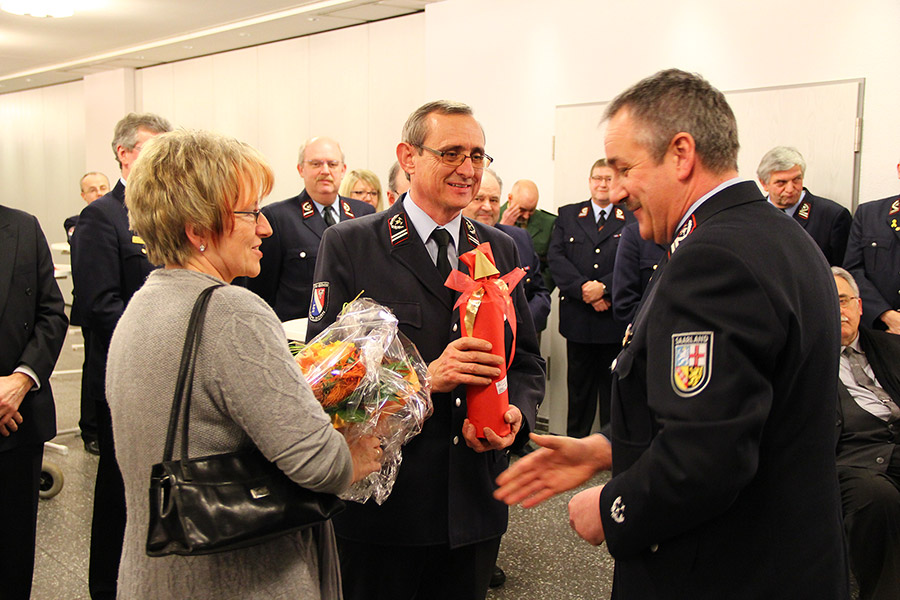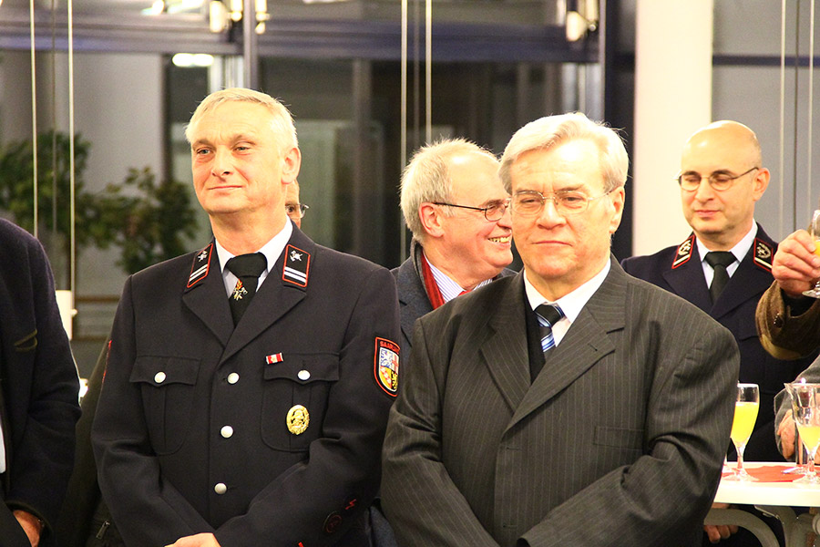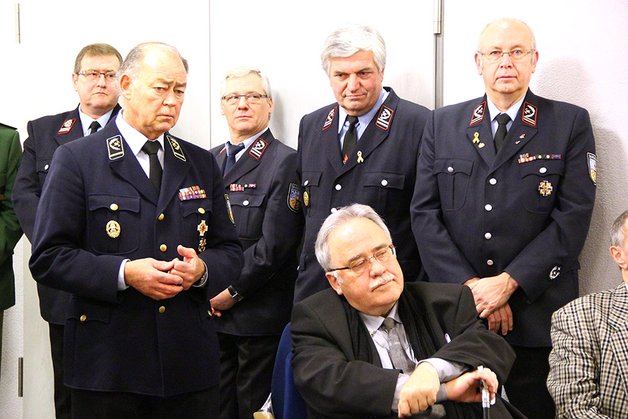Vertreter von Kreis- und Landesfeuerwehrverband, der Sprecher der Ortsvorsteher, ein Vertreter der Polizei: Die Liste der Gratulanten, die Recktenwald für seine Arbeit und sein persönliches Engagement danken wollten, war lang. Sogar aus Holland, von der Feuerwehr aus Hoorn waren Gäste angereist: Joop Jensch und seine Frau verbindet eine langjährige Freundschaft mit Hermann Josef Recktenwald, die, wie könnte es anders sein, ihren Ursprung bei der Feuerwehr hatte: Unter seiner Leitung nahm die Eppelborner Jugendfeuerwehr in den 1990er-Jahren an einem internationalen Zeltlager in Holland teil.