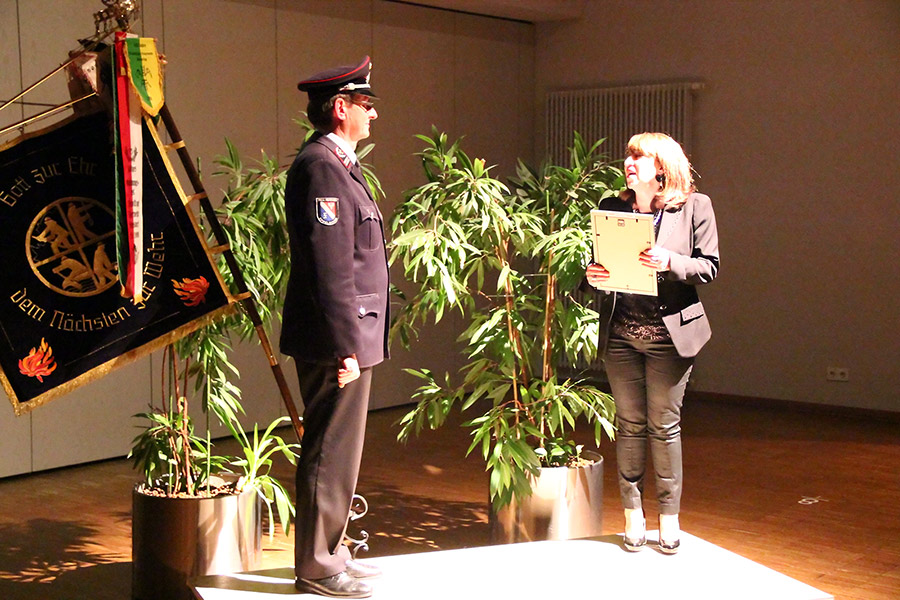 Eine weitere besondere Ehre wurde dem scheidenden Wehrführer auch noch zu teil. Aus den Händen der Bürgermeisterin konnte er neben seiner Entlassungsurkunde auch noch die Ernennungsurkunde zum Ehrenwehrführer der Gemeinde Eppelborn entgegen nehmen.