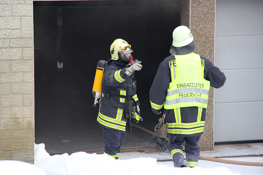 Beim Eintreffen der ersten Einsatzkräfte drang Brandrauch aus der Haustür des Zweifamilienhauses. Der Anwohner hatte das Gebäude verlassen, weitere Personen hielten sich nicht darin auf. Durch das Treppenhaus drang ein Trupp, ausgerüstet mit Atemschutzgeräten, in den stark verrauchten Keller vor und öffnete die Garagentore von innen. Das dort abgestellte Fahrzeug wurde ins Freie gebracht.