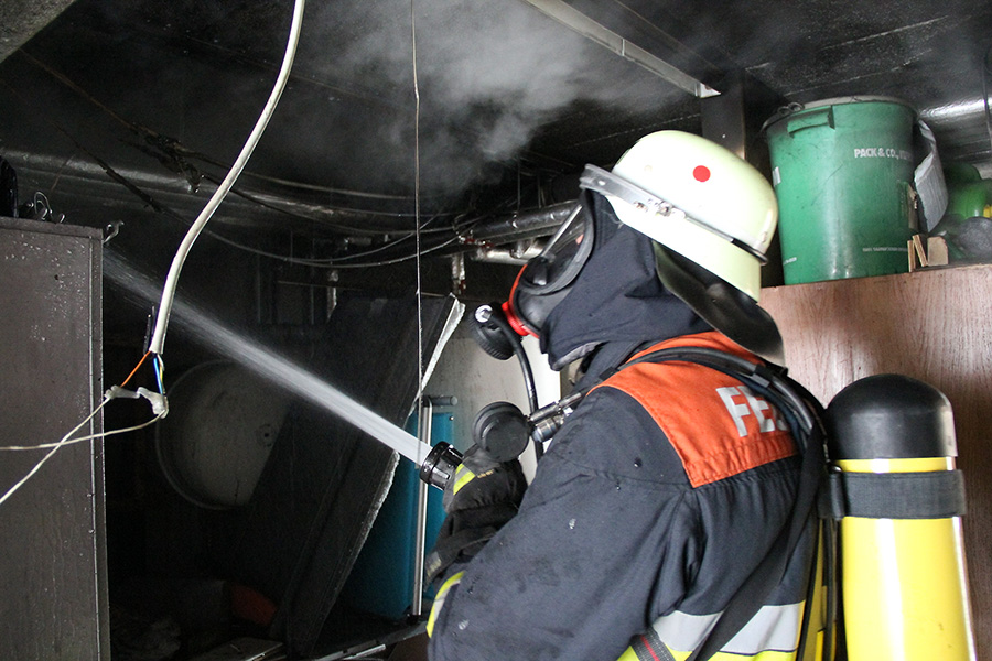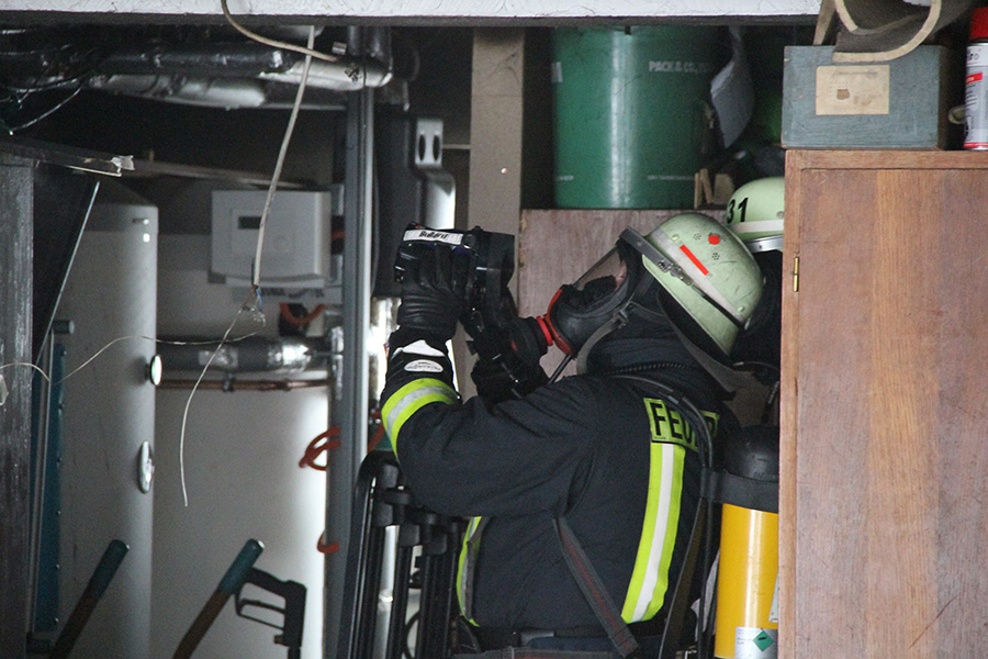 Der Brandherd konnte schnell im Bereich der Heizungsanlage lokalisiert und gelöscht werden. Auch nachdem der Brand gelöscht war, musste mit einer Wärmebildkamera mehrmals nach versteckten Glutnester gesucht und diese abgelöscht werden. Durch das schnelle Eingreifen der Feuerwehr konnte eine weitere Brandausbreitung verhindert werden. Wegen herabhängender Stromleitungen musste das Gebäude stromlos geschaltet werden. Mit Überdrucklüftern wurden Erdgeschoss und Kellerräume belüftet und der Brandrauch aus dem Gebäude gedrückt.