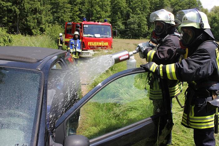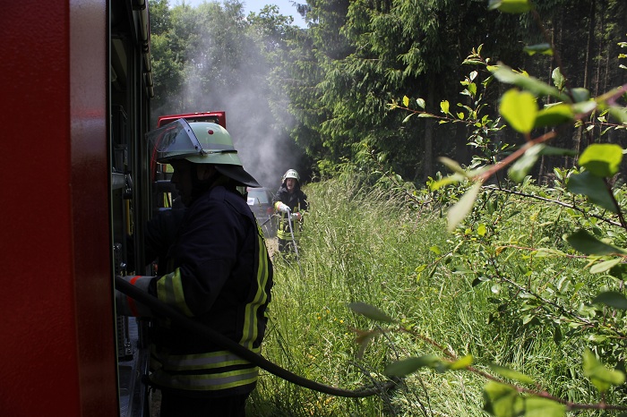 Es handelte sich glücklicherweise um eine Alarmübung, welche zuvor mit größerem Aufwand von Kameraden des Löschbezirks geplant und bei der Rettungsleitstelle angemeldet wurde. Kurze Zeit nach Alarmierung waren beide Einsatzfahrzeuge vor Ort und begannen das im "Vollbrand" stehende Fahrzeug unter schwerem Atemschutz zu löschen. Dies war bei einer Außentemperatur von ca. 28°C keine leichte Aufgabe.