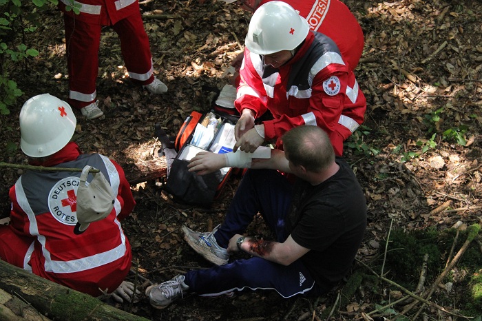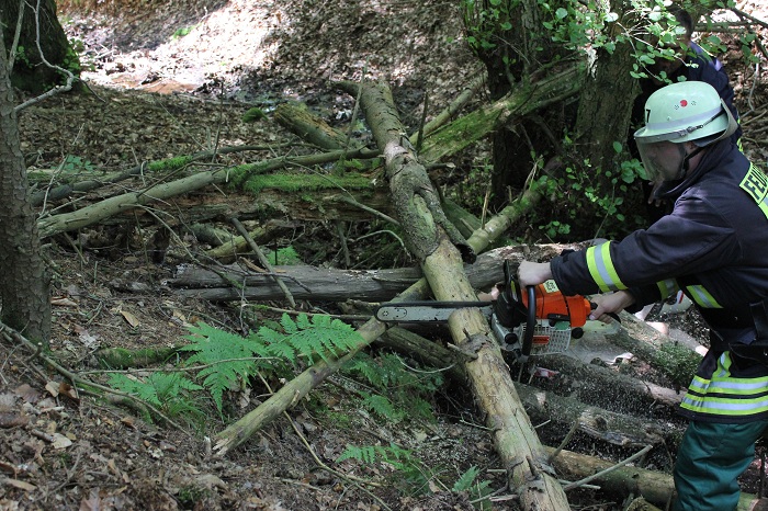 Die erste Person war bei Bewusstsein und konnte einige Angaben zum Unfallhergang machen. Diese erlitt nach einem Sturz in den Graben eine Platzwunde am Kopf, Schürfwunden am Arm sowie einen Fremdkörper im Unterarm. Die zweite Person, hatte beim Sturz in die Tiefe aufgestapelte Baumstämme ins Rollen gebracht und wurde darunter begraben. Die Einsatzkräfte des DRK begannen sofort mit der medizinischen Erstversorgung der beiden Verletzten. Die Feuerwehr musste zum Retten der 2. Person zunächst mit der Motorsäge die Person unter den Stämmen freischneiden.
