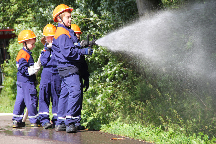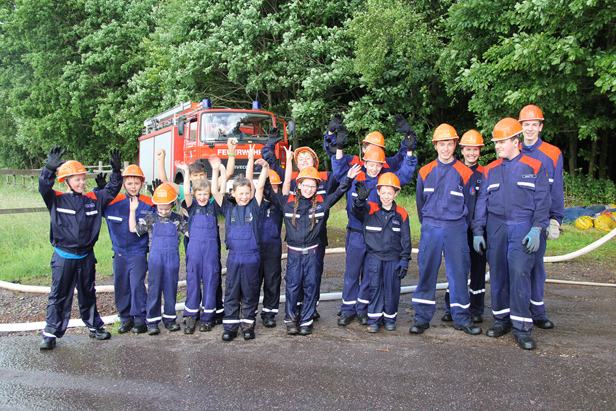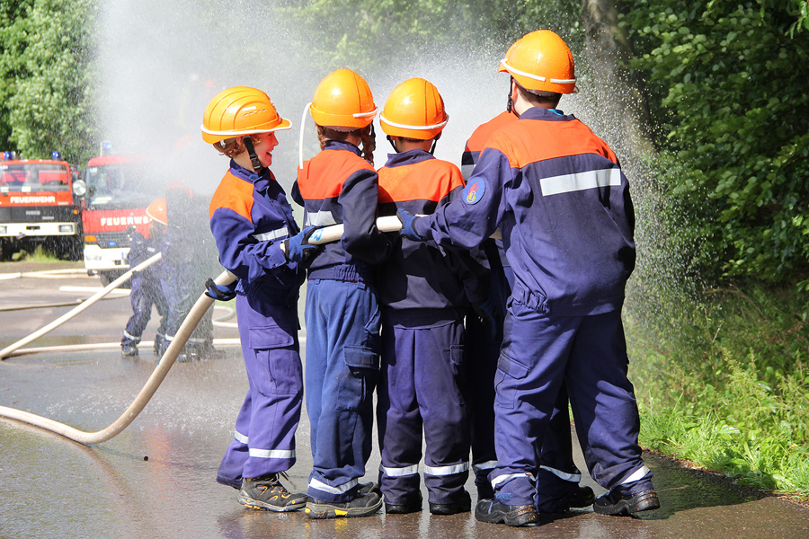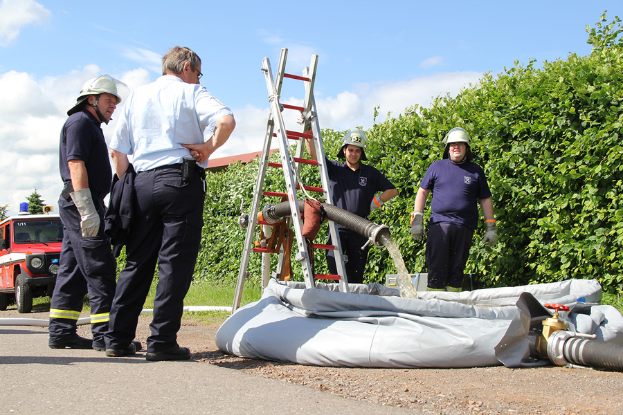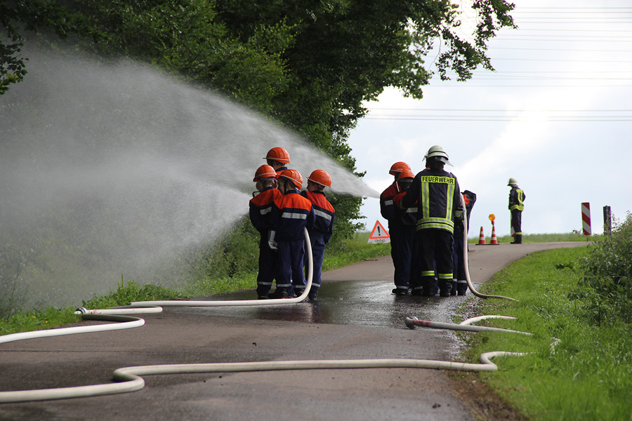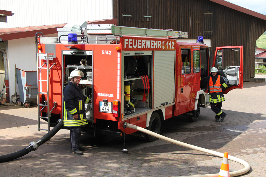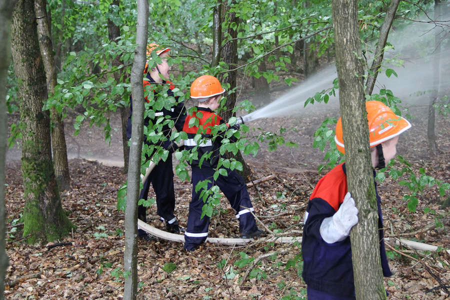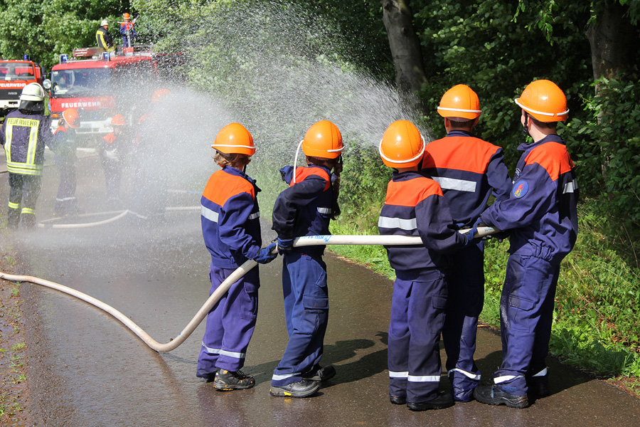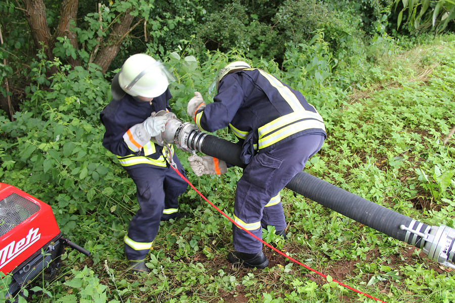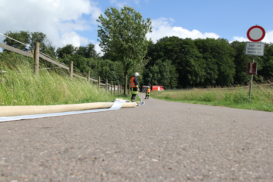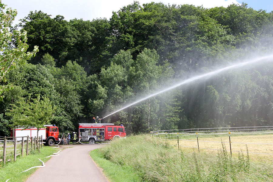 Während des Aufbaus der Leitung aus der Schleidstraße wurde für den ersten Löschangriff das Wasser aus einem Löschwasserbrunnen eines Reiterhofs entnommen. Die Jugendfeuerwehr, die ebenfalls bei dieser Übung tatkräftig mit anpackte, startete damit dann den Löschangriff am Wald. Rund 20 Minuten nach Beginn der Übung konnte schließlich "Wasser marsch" auf der langen Versorgungsleitung gegeben werden.