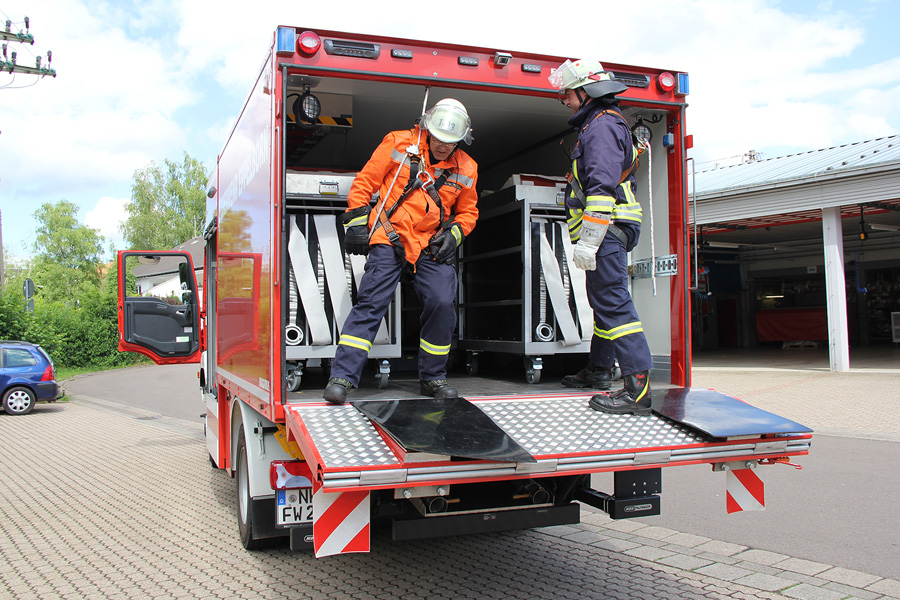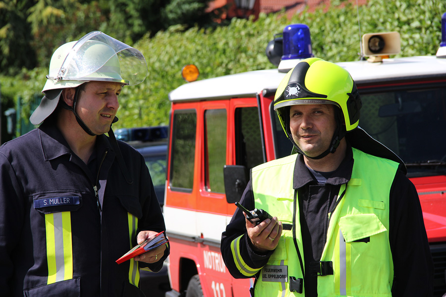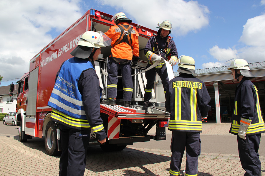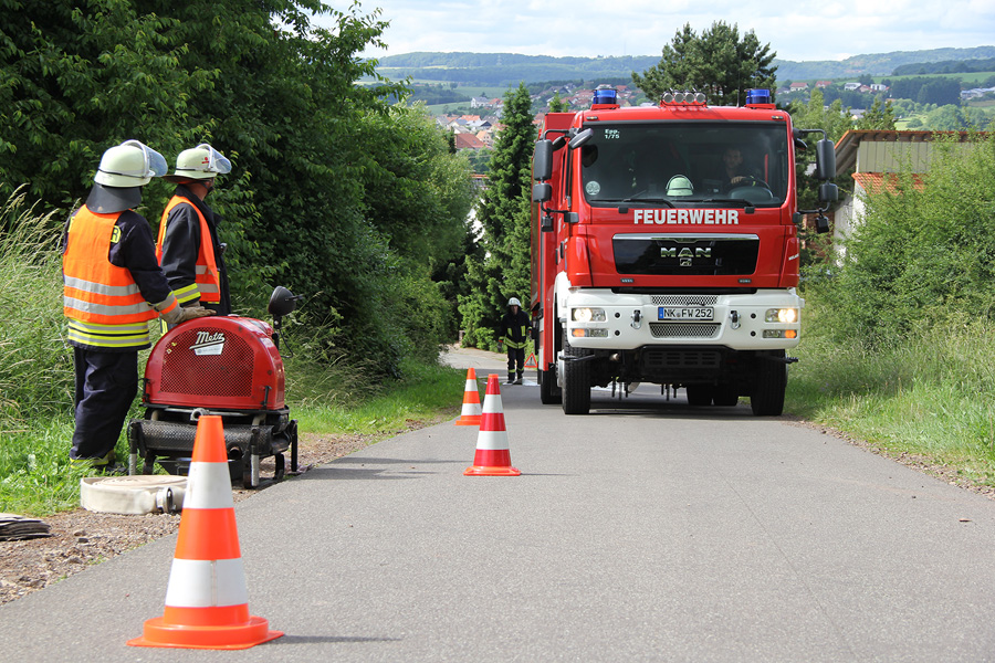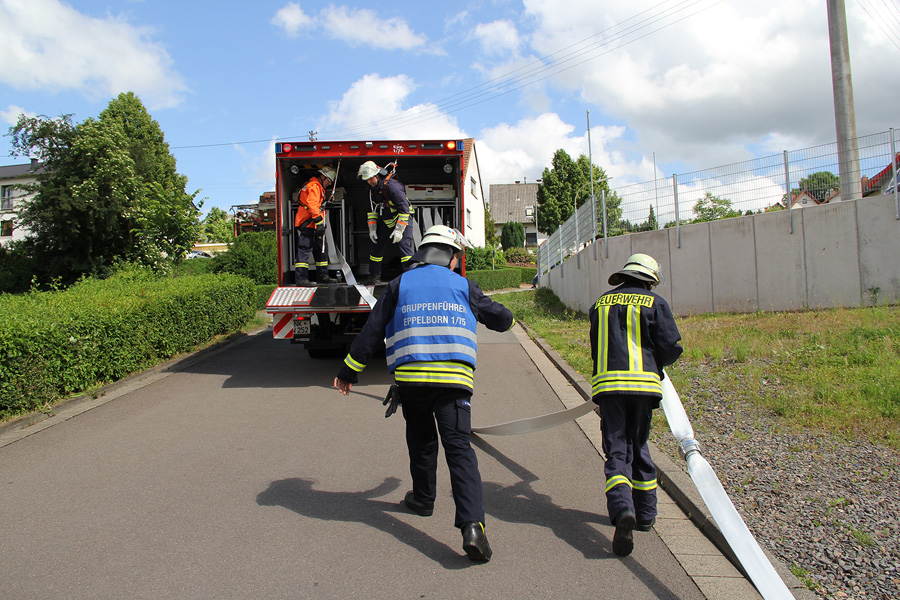 Für den Aufbau einer langen Löschwasserleitung steht in Eppelborn seit letztem Jahr ein neues Fahrzeug zur Verfügung: Der Gerätewagen Logistik (GW-L2) aus dem Löschbezirk Eppelborn kann mit seiner Standardbeladung eine 2 Kilometer lange B-Schlauchleitung während der Fahrt verlegen. Das Handling von Fahrzeug und Ausrüstung war deshalb ein Ziel der diesjährigen Waldbrandübung. Zusätzlich wurde auch die Erreichbarkeit der Einsatzkräfte im neuen digitalen Funknetz geprobt.