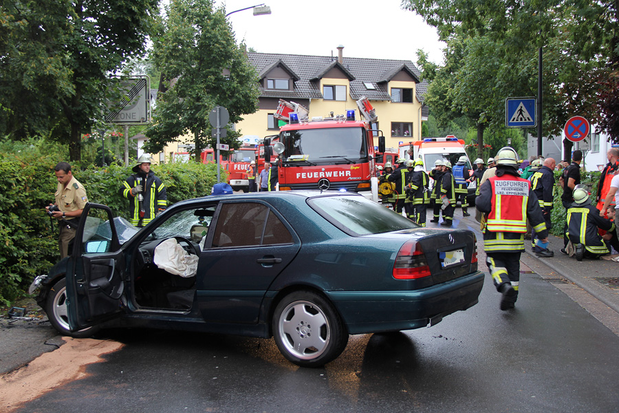 Beim Eintreffen der ersten Einsatzkräfte stand der Beifahrer neben dem Fahrzeug, der Fahrer saß noch immer auf dem Fahrersitz. Beide standen merklich unter Schock. Aus dem Fahrzeug liefen größere Mengen Kraftstoff aus, deshalb wurde als Erstmaßnahme die Fahrzeugbatterie abgeklemmt und ein C-Rohr in Bereitschaft gehalten.