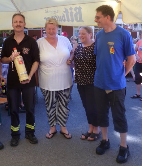 Die Vorbereitungen zu diesem in Dirmingen beliebten Event begannen schon sehr frühzeitig. Viel Arbeit steckt in einem solchen Fest und jede Hand wird beim Aufbau gebraucht. Zur Freude der Feuerwehrkameraden erschien Samstagmorgen Ortsvorsteher Manfred Klein, nicht um etwa zu sehen was die Feuerwehr so treibt, sondern um mit Tatkraft beim Aufbau zu helfen. Diese Aktion zeigt die Verbundenheit von Ortsvorsteher Manfred Klein mit den Feuerwehrkameraden aus Dirmingen. Dies kann man nicht hoch genug bewerten. Während die einen Kameraden alles aufbauten und einrichteten, waren andere Kameraden und deren Frauen und Partnerinnen an den Vorbereitungen für die Küche. Der Löschbezirk Dirmingen bietet immer am Feuerwehrfest ein reichhaltiges Speisenangebot, was aber mit viel Vorbereitungsarbeit verbunden ist. Heino Molter hat die Leitung der Küche inne und macht diese Arbeit mit viel Herzblut. Gerade das traditionelle "Schnippeln für die Erbsensuppe" macht dem Küchen-Team Spaß und die Erbsensuppenköche Hans-Werner Guthörl und Erwin Gerstner gehen von dieser Tradition nicht weg. Diese "ewige" Tradition wurde von den Alterswehrkameraden Werner Kraß und Günter Braun übernommen. Bereits einen Tag zuvor, am Freitag, sind die Kameraden von der Feuerwehr Finsterwalde-Nehesdorf angereist. Nach einer herzlichen Begrüßung konnten die weit angereisten Gäste sich erst einmal frisch machen, um dann mit einem deftigen Abendessen verwöhnt zu werden. Gegen 18 Uhr am Samstag begann dann offiziell der "Tag der offenen Tür" des Löschbezirks Dirmingen. Viele Besucher fanden den Weg zur Feuerwehr und das Bier schmeckte bei den angenehmen Temperaturen. Bürgermeisterin Birgit Müller-Closset war auch gekommen und fand sicher gute Gespräche im Kreis netter Menschen. Als der Abend fortgeschritten war, eröffnete "DJ Bodo" seine Disco. Es gab gute Musik und coole Cocktails und jeder kam auf seine Kosten. Es ging wohl bis tief in die Nacht hinein, denn als morgens um 05:30 Uhr die Köche kamen, um die Erbsensuppe anzufeuern, waren noch ein paar übriggebliebene Gäste am Bierstand. Die bewährte Nachtwache, Rudi Spindler, konnte nun endlich in Richtung seines wohlverdienten Schlafes gehen. Der LB Dirmingen bedankt sich bei Rudi Spindler für die Unterstützung. Die ersten Gäste fanden sich dann wieder am Sonntagmorgen zum Frühschoppen ein. Das Wetter war gut und so nach und nach füllten sich die Garnituren und der Bierstand. Der Feuerwehrkamerad Markus Blum organisierte über seinen Arbeitgeber AKV Kranvermietung Günter Hüther e.K aus Zweibrücken einen schweren Kran, der dazu verwendet wurde, das Cola-Kisten stapeln als Sicherungsmaßnahme zu unterstützen. Für die Bereitstellung des Autokranes möchte sich der Löschbezirk Dirmingen bei der Fa. AKV ([url]www.akv-zw.de[/url]) bedanken. Markus Blum schaffte selbst am Samstagabend 22 Kisten zu stapeln. Er wurde danach allerdings von seiner Cousine Sarah Blum überboten, die 25 Cola-Kisten stapeln konnte. Die Sicherungsmaßnahmen übernahmen dankenswerterweise die Kameraden des Löschbezirk Bubach-Calmesweiler, die in der Absturzsicherung aktiv sind. Wer 20 Kisten schaffte bekam als kleine Belohnung 1 Meter Bier. Ortsvorsteher Manfred Klein brachte Herr Köhl von der Bitburger Brauerei mit, der für den Tag der offenen Tür, als Unterstützung des Löschbezirk Dirmingen, ein Fass Bier spendete. Für diese Spende möchten sich die Feuerwehrkameraden bei der Bitburger Brauerei ([url]www.bitburger.de[/url]), vertreten durch Herr Köhl, bedanken. Mittlerweile waren dann auch Feuerwehrkameraden der Feuerwehr Pfaffenthal aus Luxemburg eingetroffen. Löschbezirksführer Bernd Detzler begrüßte die Gäste aus Pfaffenthal, die jedes Jahr gerne nach Dirmingen kommen. Bürgermeisterin Birgit Müller-Closset, Chefin der Feuerwehr in der Gemeinde Eppelborn, fand auch an diesem Tag wieder den Weg zum Feuerwehrfest nach Dirmingen. Ihre freundliche, offene Art wurde von den Dirminger Bürger gut angenommen und es machte den Eindruck, dass es der Rathauschefin gut in Dirmingen gefallen hat. Ein weiterer Höhepunkt war dann gegen 16 Uhr die Schauübung der Jugendfeuerwehr Dirmingen. Diese jungen Feuerwehrleute zeigten Ihr Können und es konnte nach einem schnellen Aufbau des Löschangriffs schnell "Wasser Marsch" auf drei Strahlrohren gegeben werden. Überwacht wurde diese Übung von Marina Haupenthal und Markus Lambert. Uwe Schulz erklärte über ein Megaphon die einzelnen Stufen der Übung. Die Jugendfeuerwehr hat diese Übung mit Bravour gemeistert. Im Anschluss wurden neue Überjacken an die Kids übergeben. Diese Jacken dienen dem Schutz bei schlechtem Wetter und wurden vom Löschbezirk selbst angeschafft. Die anwesenden Gäste und Besucher machten aus diesem Tag der offenen Tür eine sehr schöne Veranstaltung und es war wirklich toll, mit diesen netten Menschen zu reden und Spaß zu haben. Zum Schluss des Berichtes möchte sich der Löschbezirk Dirmingen bei allen Besuchern und Helfern die zum Gelingen der beiden Festtage beigetragen haben recht herzlich bedanken. Das Küchen-Team hofft, den Geschmack der Gäste getroffen zu haben. Die Kameraden aus dem Löschbezirk Dirmingen würden sich auf einen Besuch der Bürger im nächsten Jahr wieder freuen.