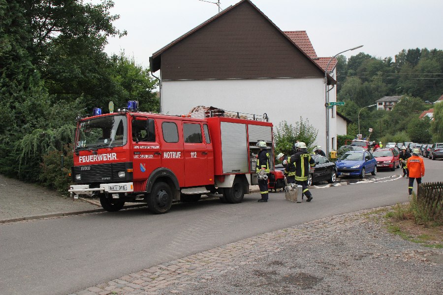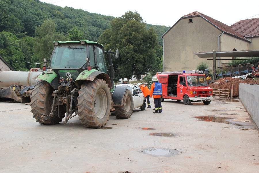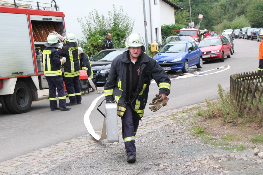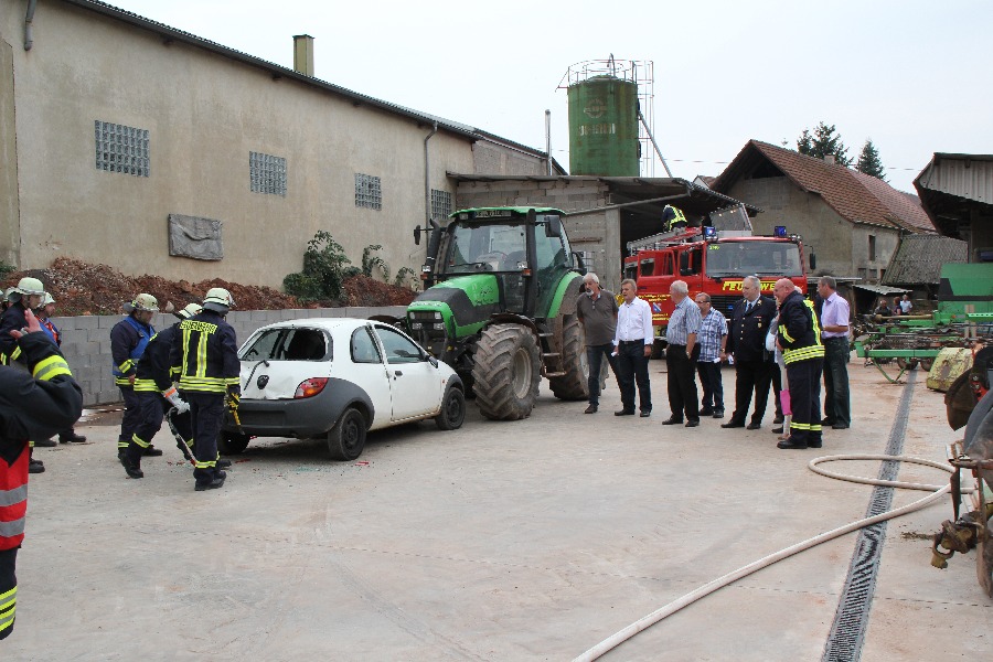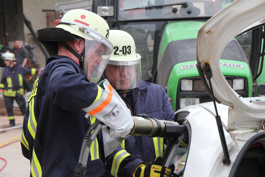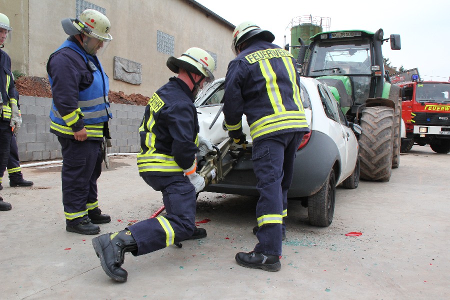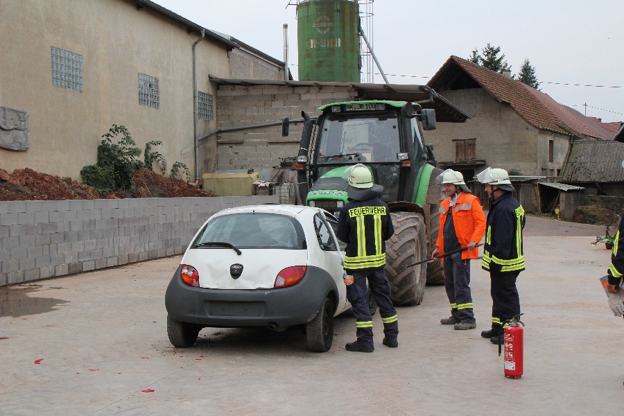 Zahlreiche Beobachter hatten sich bereits in Macherbach versammelt, als das erste Fahrzeug aus dem Löschbezirk Macherbach, der die Übung vorbereitet hat eintrifft. Dessen Aufgabe ist es zunächst, die Personen im verunfallten Fahrzeug zu betreuen und die Einsatzstelle zu sichern. Bei dem Alarmstichwort PKW-Unfall wird der Löschbezirk Bubach-Calmesweiler mitalarmiert, dieser unterstützt nach dem Eintreffen die Kräfte des Löschbezirks Macherbach.