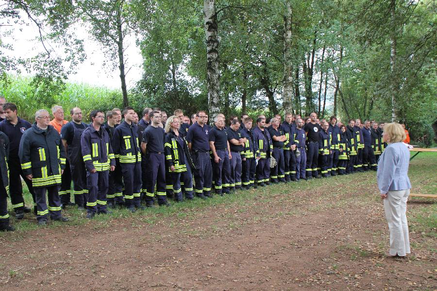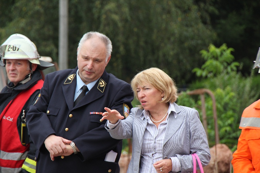 Bürgermeisterin Birgit Müller-Closset fand im Anschluss an die Übung lobende Worte für ihre Feuerwehrleute. Gemeinsam mit Wehrführer und Gesamtübungsleiter Klaus Theis sowie Kreisbrandinspekteur Werner Thom lobte sie die gezeigte Leistung bei dieser Übung, die zusammenfassend sehr gut verlief.
