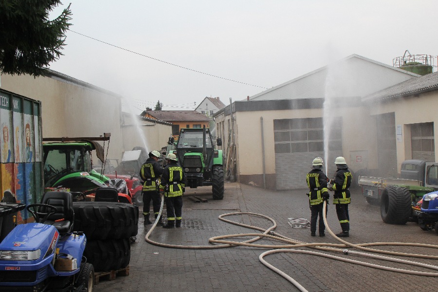 Durch die Einsatzkräfte aus Bubach-Calmesweiler wird währdenddessen auch ein brennender Schlepper abgelöscht, die Kräfte aus Wiesbach führen parallel im Bereich der Firma Landmaschinen Alt einen Löschangriff durch.
