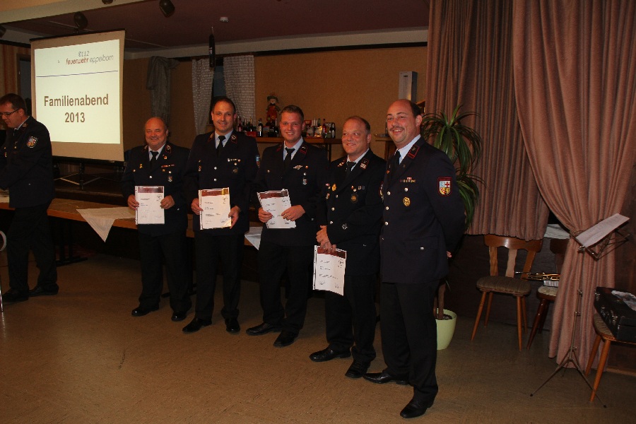 Fanfarenzugführer Jörg Olliger zeichnete Markus Schmitt für seine 10-jährige Mitgliedschaft im Musikzug der Feuerwehr aus. Thomas Saar, Bernd Erberich und Sascha Müller erhielten für 20 beziehungsweise 30 Jahre Zugehörigkeit eine Auszeichnung. der Bundesvereinigung Deutscher Musikverbände. Eine besondere Ehrung erhielt der Landesstabfsführer Günter Schmitt, der seit 45 Jahren im Fanfarenzug der Feuerwehr Eppelborn aktiv tätig ist.