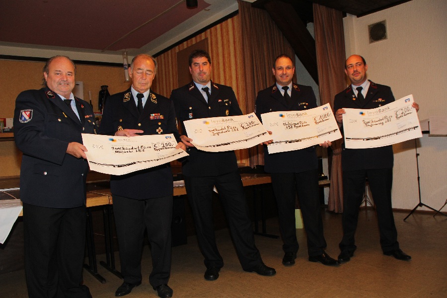 Der Förderverein überreichte Schecks zur Unterstützung der Feuerwehrarbeit: Je 200 Euro erhielten Jugendfeuerwehr, Alterswehr und Fanfarenzug, weitere 1.000 Euro gingen an die Einsatzabteilung des Löschbezirks.