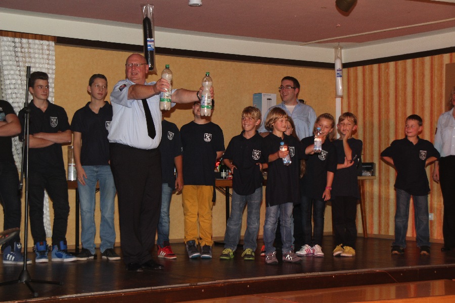 Nach dem Essen hatte die Jugendwehr einen Wettbewerb, und die Kameraden der Aktivwehr einen Tanzauftritt und eine Tombola vorbereitet und sorgten so für ausgelassene Stimmung und Kurzweil. Wehrführer Klaus Theis und Schriftführer Eric Holzer mussten sich bei dem Wettbewerb "Schlag die Jugendwehr" bei den Geschicklichkeitsspielen dem Nachwuchs geschlagen geben.