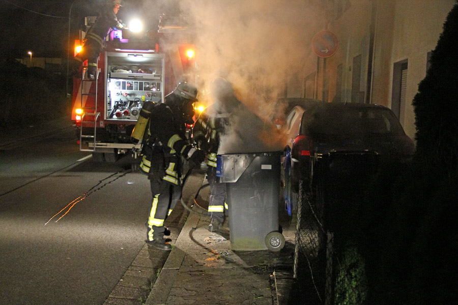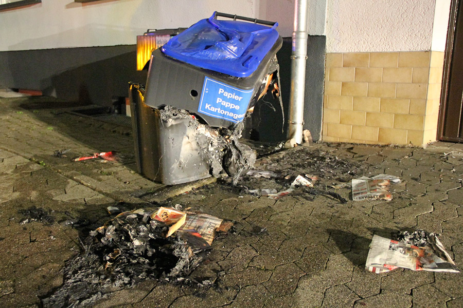 Nur wenige Meter weiter hatten die Feuerteufel noch einmal zugeschlagen: Bei einer Erkundung der Altpapiergefäße der Nachbarhäuser wurde eine weitere, durch Hitze stark beschädigte Tonne entdeckt. Hier war das Feuer von Unbekannten wohl bereits mit Wasser notdürftig gelöscht worden. Auch hier mussten die Altpapierreste abgelöscht werden, um ein Wiederentzünden zu verhindern.