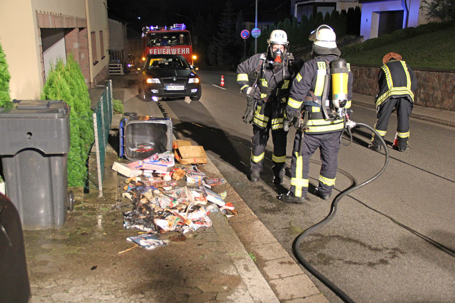 Ein Zeitungsausträger der "Saarbrücker Zeitung" hat in der Nacht zum 21. September 2013 gegen 01:51 Uhr den Brand einer Altpapiertonne in der Schloßstraße entdeckt und die Feuerwehr alarmiert.