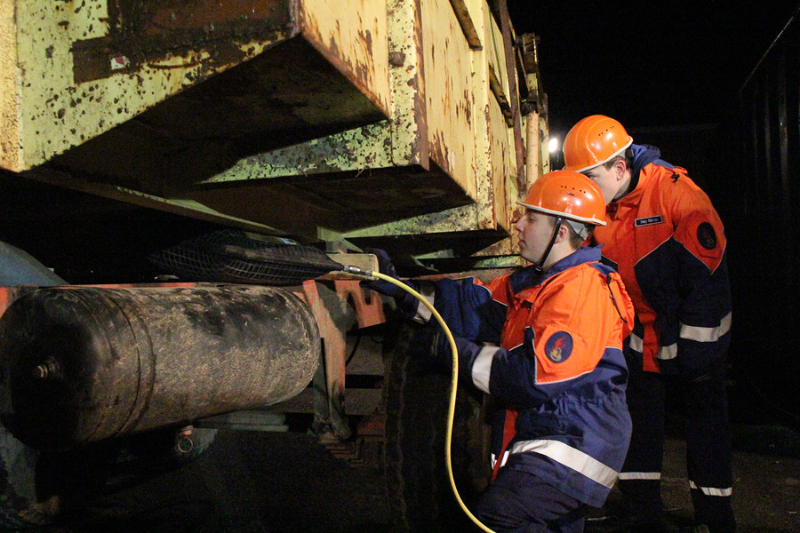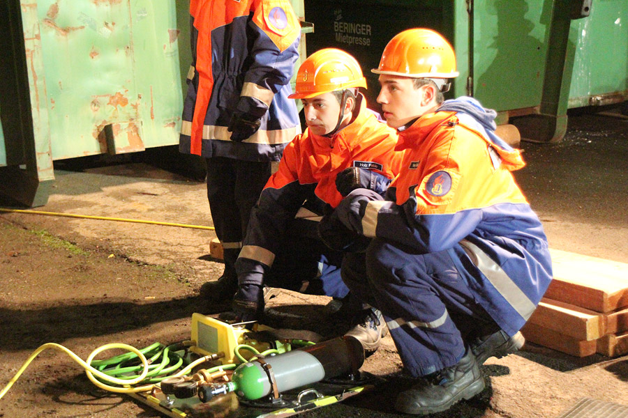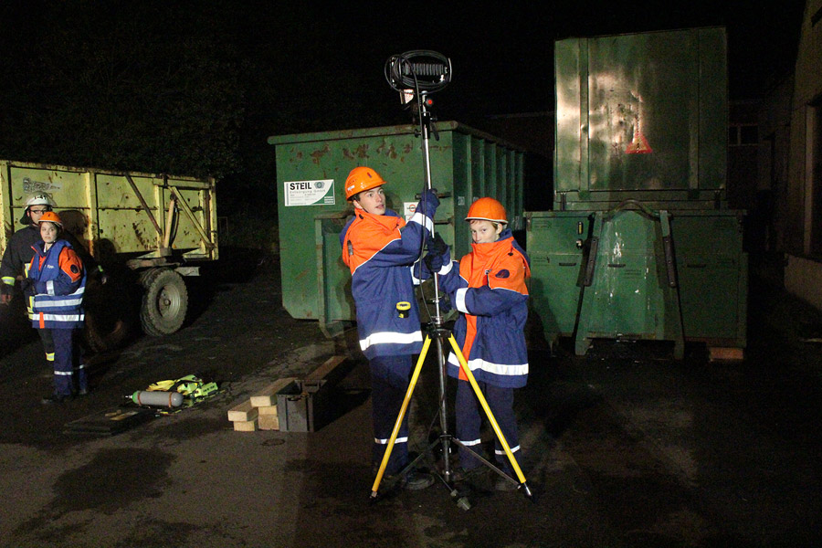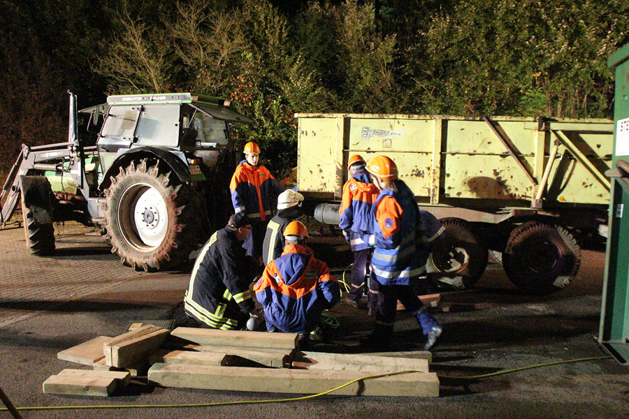 Für die erfahrenen Jugendfeuerwehrleute war die Aufgabe etwas anspruchsvoller: Mit pneumatischen Hebekissen mussten zwei Personen befreit werden, die unter einem Traktor mit Anhänger eingeklemmt waren. Für alle galt dabei: Die jeweiligen Einsatzstellen mussten wegen der Dunkelheit sorgfältig ausgeleuchtet werden.