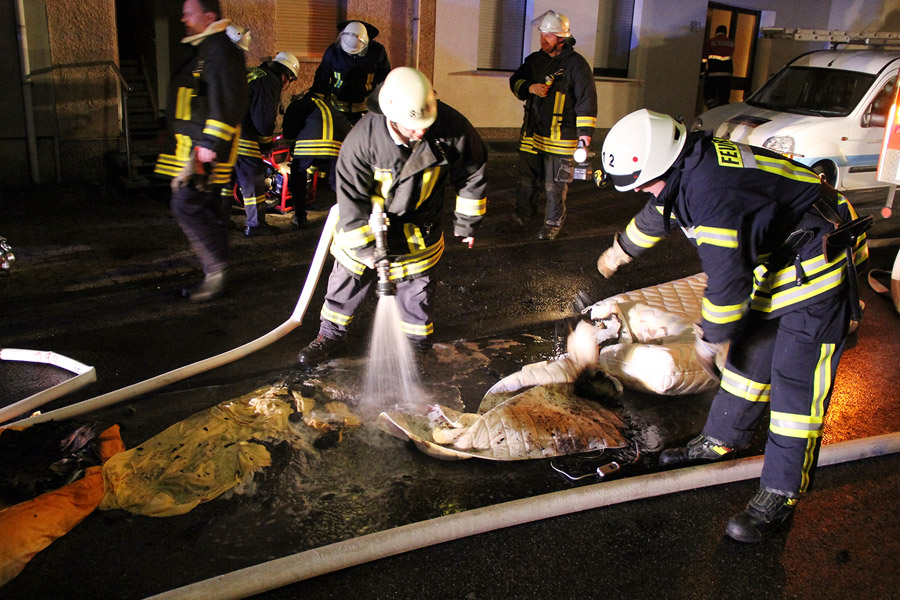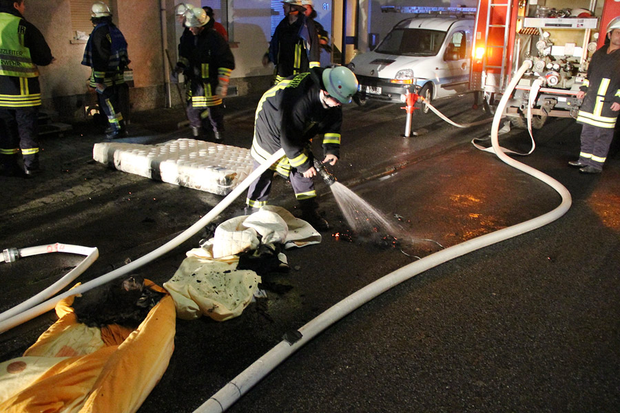 Die Matratze und Bettwäsche wurde von einem Trupp unter Atemschutz aus dem verrauchten Schlafzimmer gebracht und vor dem Gebäude abgelöscht. Zu größerem Schaden ist es zum Glück aber nicht gekommen: Durch das schnelle Eingreifen der Feuerwehr konnte ein Ausbreiten des Feuers und somit ein Zimmerbrand verhindert werden.