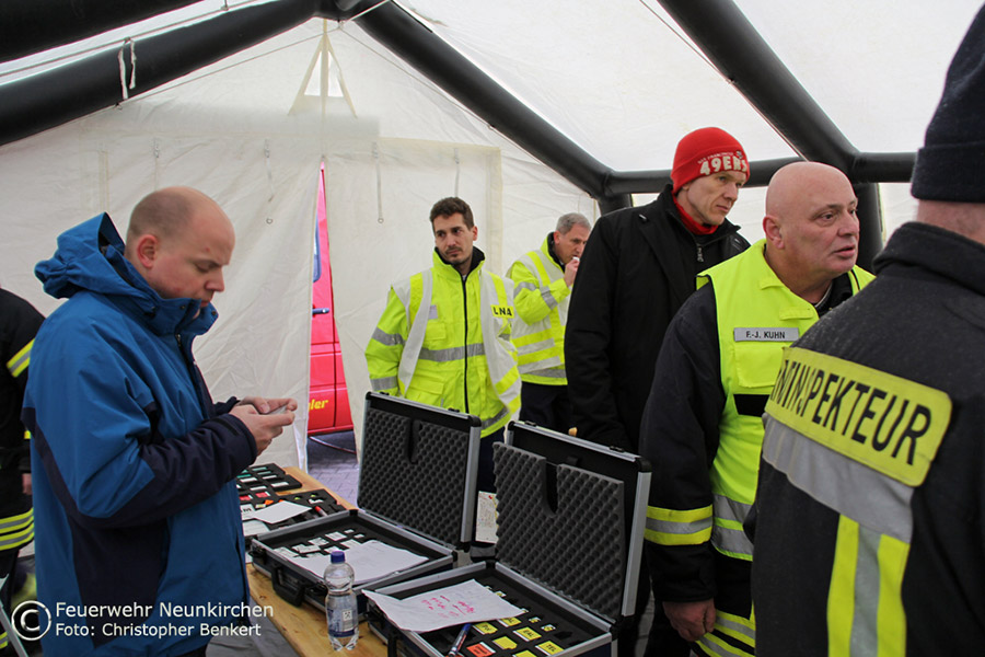 Im Einsatzverlauf richteten Feuerwehr und Hilfsorganisationen im Gewerbegebiet "An der alten Ziegelei" einen Bereitstellungsraum ein und bauten dort auch ihre Einsatzleitung auf. Hierfür war bereits kurz nach Einsatzbeginn die Technische Einsatzleitung des Landkreises Neunkirchen zusammen mit ihrem bei der Feuerwehr Ottweiler stationierten Einsatzleitwagen alarmiert worden. Mit zu dem Team des Einsatzleitwagens gehört auch der stellvertretende Löschbezirksführer Stephan Rein aus dem Löschbezirk Wiesbach, der gegen 9:38 Uhr alarmiert wurde, und direkt von seinem Arbeitsplatz in einer Neunkircher Schule zum Einsatzort eilte. Ebenso wurden die Einsatzleitung Rettungsdienst mit Organisatorischem Leiter Rettungsdienst und Leitendem Notarzt alarmiert sowie ein Fachberater des Technischen Hilfswerkes.