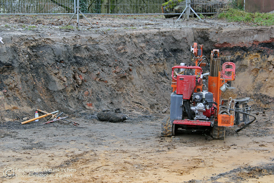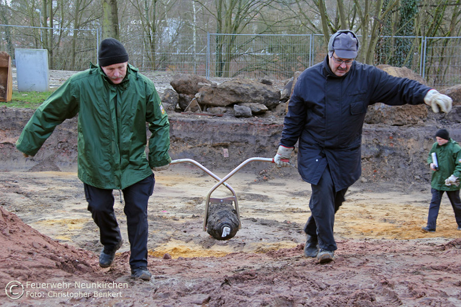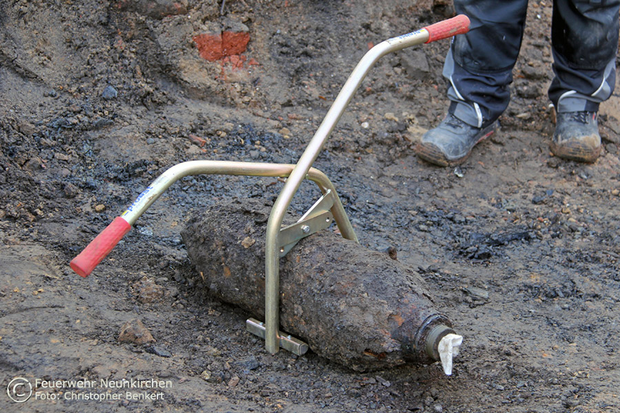 [b]Neunkirchen.[/b] Bei Tiefbauarbeiten neben dem städtischen Kindergarten in der Neunkircher Talstraße entdeckten Bauarbeiter am Montagmorgen, 27. Januar gegen 9:20 eine nicht detonierte Fliegerbombe aus dem Zweiten Weltkrieg im Erdreich. Die äußerlich unbeschädigte Sprengbombe steckte in der Wand der Baugrube.