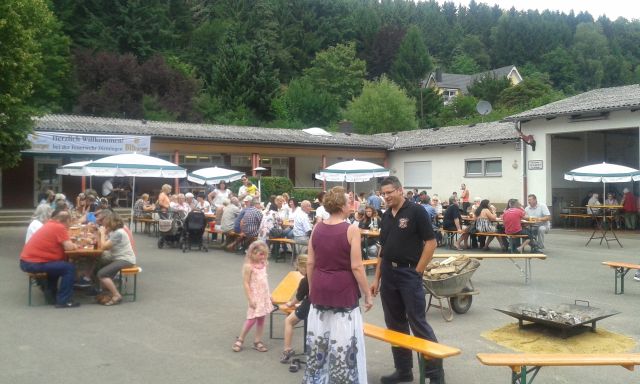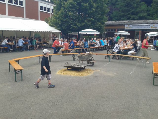 Nach und nach füllte sich der Platz, das Zelt und die Fahrzeughalle mit Besuchern und es wurde ein kurzweiliger Abend mit viel Stimmung. Die Gäste fühlten sich sichtlich wohl bei der Feuerwehr und auch das Essen wurde gut angenommen.Ein absoluter Höhepunkt am Samstagabend war die einmalige Feuershow der Familie Feit (PhysioPur). Werner, Christian und Christine boten ein tolles Programm. Der Sonntag begann schon früh um 6 Uhr. Das Küchen-Team begann mit den Vorbereitungen zum Mittagessen. Weitere Kameraden sorgten für die Sauberkeit des Schulhofes und der Bierstände. Die Tische und Bänke wurden gereinigt, damit die Besucher am Sonntag ein sauberes Umfeld vorfinden konnten. Das Wetter war am Sonntag optimal und so kamen bereits viele Bürger zum Mittagessen. Die RK-Illtal leisteten “Amtshilfe” und “besetzten” den Bierstand zum Frühschoppen. Sie verrichteten Ihren Dienst bis in die späten Nachmittagsstunden bis die Ablösung aus den Reihen der Feuerwehr kam. Als kulinarische Leckereien wurden über die Tage vom Küchen-Team, unter der Leitung von Heino Molter, angeboten: