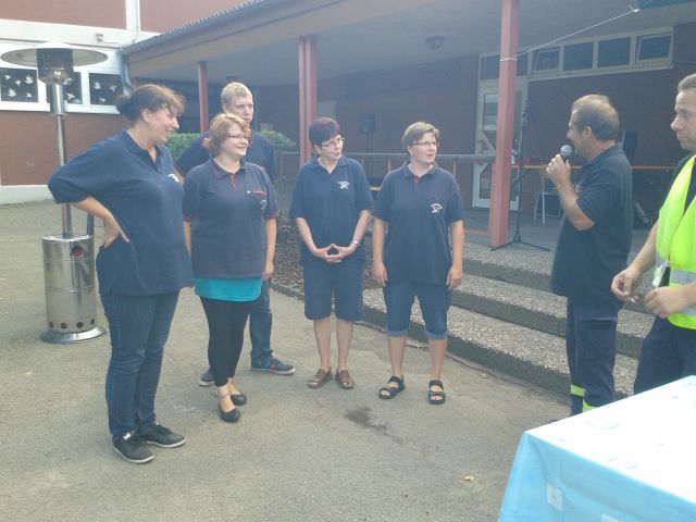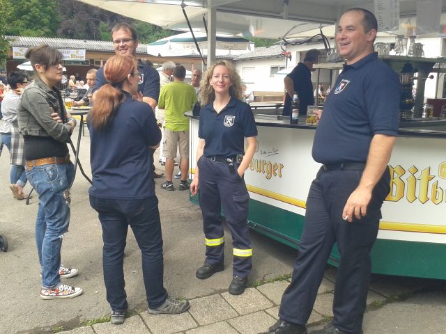 Der offizielle Beginn der “Tage der offenen Tür” war vom Festausschuss auf 18 Uhr festgelegt. Schirmherrin war die Chefin der Wehr, Bürgermeisterin Birgit Müller-Closset, die auch mit geschickter Hand und nur einem Hammerschlag den Zapfhahn in das von der Bitburger Brauerei gesponsorte Fass trieb. Gleich danach begann die Bürgermeisterin mit dem Zapfen des leckeren Gebräus und zeigte auch dort handwerkliches Geschick. Das gut gekühlte Bitburger wurde von den Feuerwehrleuten unter den Gästen verteilt. Erst nachdem das Fass ganz leer gezapft war, beendete die Rathauschefin Ihre Arbeit. Dies zeugt von Engagement und Durchaltevermögen der Bürgermeisterin, die vor dem Fassanstich noch lobende Worte für die Feuerwehrleute aus Dirmingen fand. Auch sprach Sie die dringend notwendige Ersatzbeschaffung eines Löschfahrzeuges für die Bürger von Dirmingen an. Dies soll in der nächsten Gemeinderatssitzung am 25. September 2014 auf den Weg gebracht werden. Markus Lambert, der Löschbezirksführer, begrüßte die anwesenden Gäste. Hervorgehoben wurden die Kameraden der Partnerfeuerwehr aus Finsterwalde, zu denen schon über 20 Jahre eine Freundschaft besteht. Ortsvorsteher Manfred Klein lobte in seiner Rede die Arbeit und den Team-Geist der Dirminger Feuerwehrleute. Er hob die gute Jugendarbeit hervor und zeigte, dass er stolz darauf ist in Dirmingen eine funktonierende und aktive Feuerwehr zu haben.