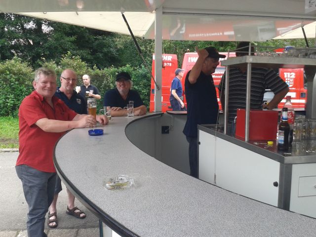 Bereits am Freitag reisten die Kameraden und Kameradinnen aus Nehesdorf (Finsterwalde) in Brandenburg an. Morgens früh starteten die Nehesdorfer um die runde 850 km hinter sich zu bringen. Gegen 15 Uhr waren Sie dann in Dirmingen angekommen und wurden herzlich begrüßt. Es gab, wie es üblich ist, ein Begrüßungstrunk. Dann wurden die Quartiere bezogen. Nach einer Frischmachung traf man sich wieder am Gerätehaus, wo das gemeinsame Abendessen wartete. Die Feuerwehrleute aus Dirmingen waren noch fleissig dabei, den Festaufbau durchzuführen. Nach getaner Arbeit flossen noch ein paar Getränke durch die durstigen Kehlen. Anschließend besuchten die Gäste aus Finsterwalde mit einigen Kameraden aus Dirmingen noch die örtliche Gastronomie und es wurde ein lustiger, kurzweiliger Abend.