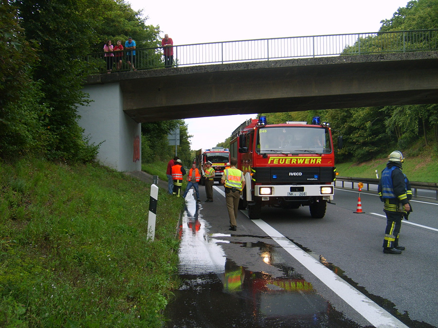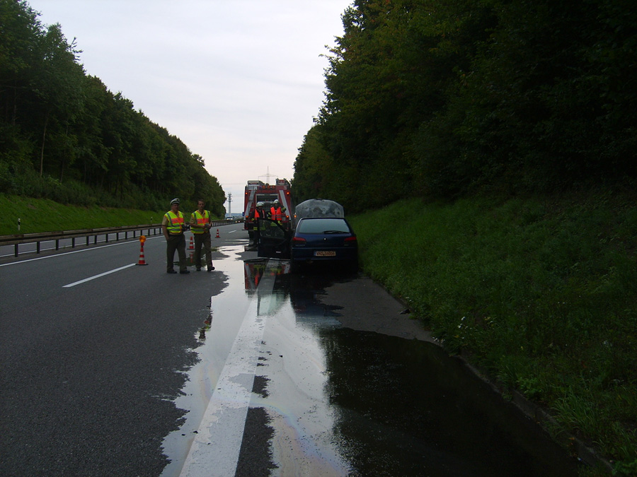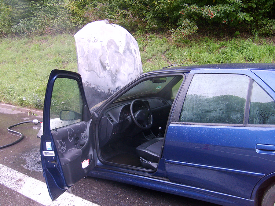 Ein Peugeot ist am 29. August 2014 kurz vor der Anschlußstelle Illingen in Flammen aufgegangen. Der Fahrer, der mit Überführungskennzeichen unterwegs in Fahrtrichtung Saarbrücken war, konnte das Fahrzeug noch auf dem Standstreifen anhalten und die Feuerwehr alarmieren.