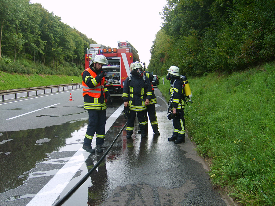 Der Verkehr musste während der Löscharbeiten einspurig an der Einsatzstelle vorbeigeleitet werden. Der Fahrer blieb bei dem Brand unverletzt, an dem Fahrzeug entstand Totalschaden.