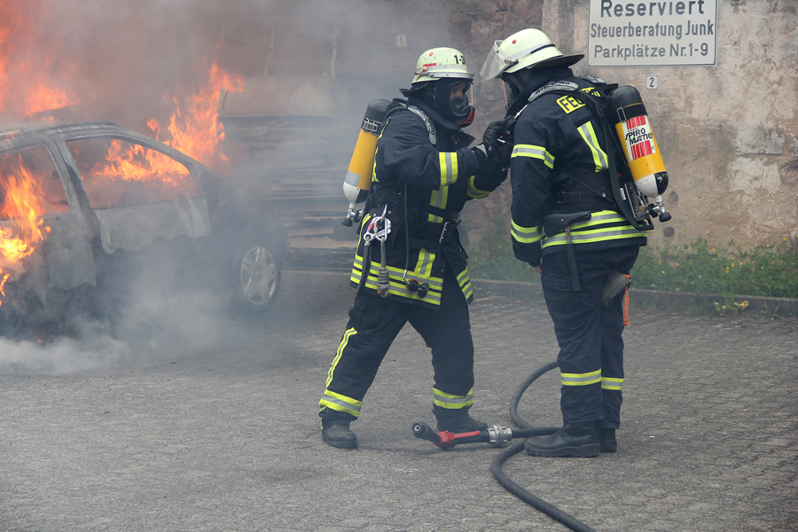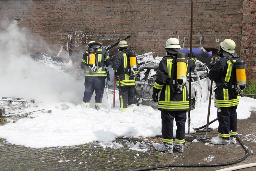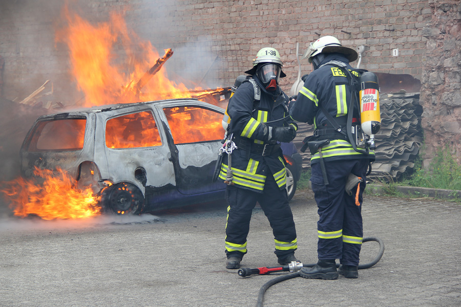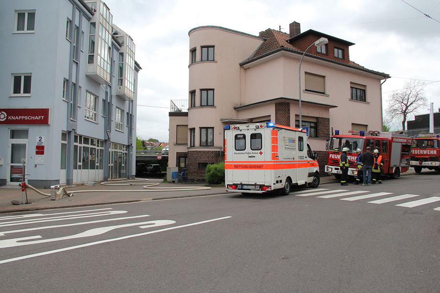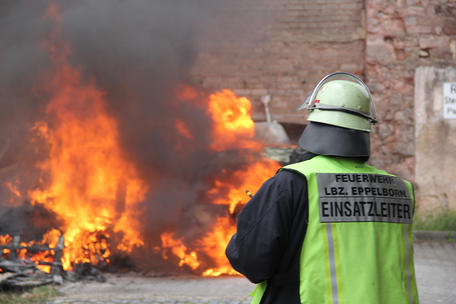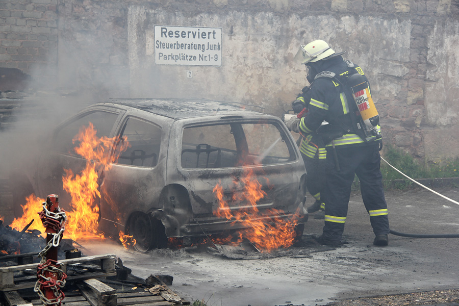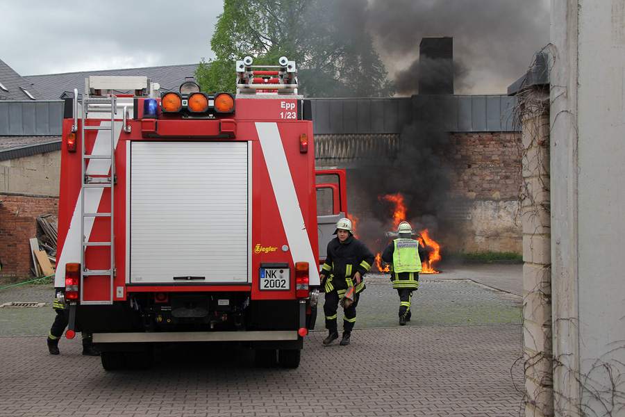 Dichter Rauch steigt am Vormittag des 09. Mai 2015 hinter einem Geschäftshaus am Kirchplatz in Eppelborn auf. Ein Palettenstapel ist im Hinterhof, unmittelbar hinter dem Pfarrsaal in Brand geraten. Anwohner und Passanten, einer davon ein Feuerwehrmann, die auf das Feuer aufmerksam geworden waren, versuchen noch, mit einem Gartenschlauch und mehreren Feuerlöschern den Brand zu löschen. Doch die Flammen sind bereits zu groß: Die Löschversuche bleiben erfolglos und können nicht verhindern, dass das Feuer auf einen Twingo übergreift. Bei Ankunft der Einsatzkräfte aus den Löschbezirken Eppelborn und Hierscheid stehen der Pkw und der Palettenstapel im Vollbrand, die Flammen schlagen meterhoch. Ausgerüstet mit Atemschutzgeräten beginnt der Angriffstrupp mit der Brandbekämpfung. Mit Wasser können die Flammen niedergeschlagen werden. Schließlich werden der Twingo und der Palettenstapel mit Löschschaum geflutet, da das Feuer immer wieder aufflammt. Weil die Ersthelfer giftige Rauchgase eingeatmet hatten, wird ein Rettungswagen der Rettungswache Lebach nachgefordert. Drei von ihnen werden nach einer ersten Untersuchung zur weiteren Überwachung in ein Krankenhaus gebracht. An dem Pkw entstand Totalschaden, ein Übergreifen der Flammen auf das benachbarte Gebäude kann durch den schnellen Einsatz verhindert werden. Die Ursache für das Feuer ist unbekannt. Beamte der Kriminalpolizei waren vor Ort und haben die Ermittlungen aufgenommen. Die Kossmannstraße musste aufgrund der Löscharbeiten im Bereich der Einmündung zur B10 voll gesperrt werden, wodurch es zu Behinderungen kam.