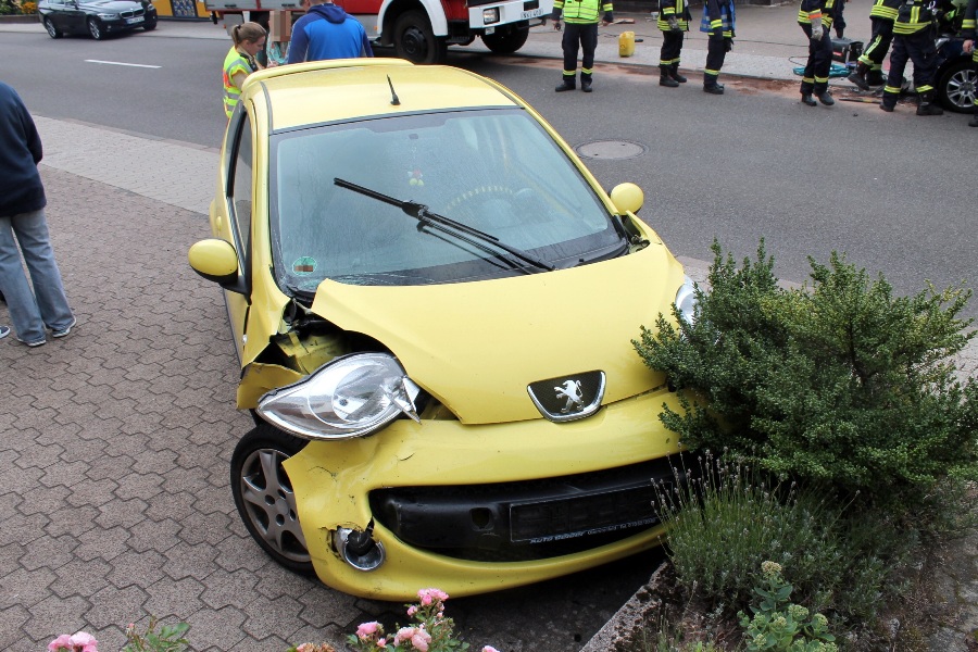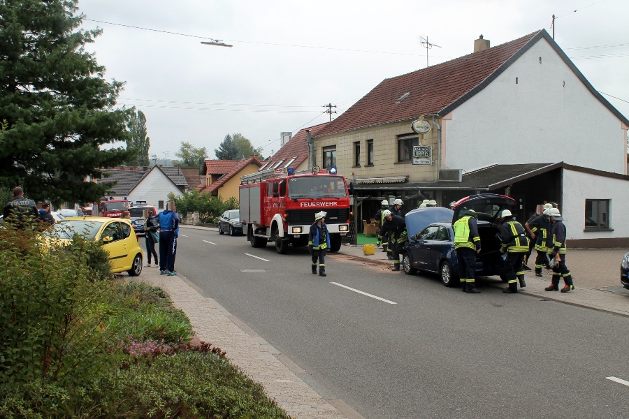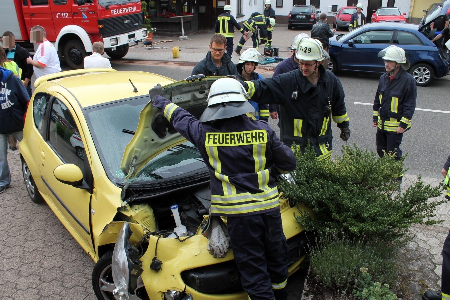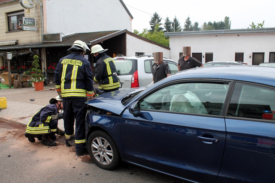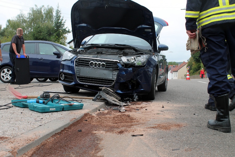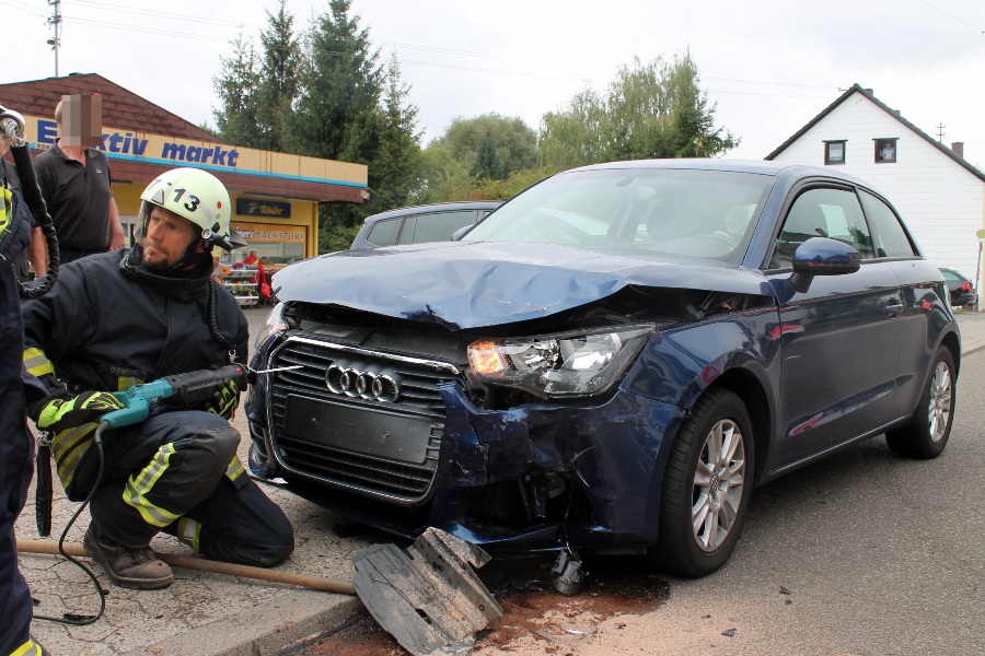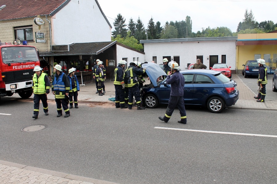 Am Samstag dem 05.09.2015 ereignete sich um die Mittagzseit ein Verkehrsunfall in der Hauptstraße in Wiesbach in Höhe des Aktiv Marktes bei dem drei Personen leichte Verletzungen erlitten. Laut Notruf sollte ein Pkw nach dem Verkehrsunfall Feuer gefangen haben. Sofort wurden die Löschbezirke Wiesbach und Eppelborn mit der Meldung "PKW Brand nach VU" alarmiert. Beim Eintreffen der ersten Einheit konnte allerdings schnell Entwarnung gegeben werden. Anscheinend hatten nur auslaufende Betriebsstoffe, welche im Motorraum verdunsteten für die Rauchentwicklung gesorgt. Die Einsatzkräfte aus Eppelborn konnten daraufhin noch während der Anfahrt ihren Einsatz abbrechen. Der Löschbezirk Wiesbach sicherte die zunächst die Unfallstelle ab und nahm auslaufende Betriebsstoffe an einem der beiden Fahrzeuge auf. Auch die Fahrzeugbatterien wurden durch die Einsatzkräfte von den beiden Fahrzeugen abgeklemmt. Durch die massive Verformung des Motorraum an einem Fahrzeug musste sich mit einer elektrischen Säge und einer Brechstange Zugang zum Motorraum verschafft werden. Nach ersten Erkenntnissen wollte eine 19 jährige Fahrerin mit ihrem gelben Peugeot auf den Parkplatz des aktiv Marktes abbiegen und übersah dabei den blauen Audi, welcher mit zwei Mitte 20 Jahre alten Personen besetzt, auf der Gegenfahrbahn fuhr. Durch die Missachtung der Vorfahrt kam es zum Zusammenstoß beider Fahrzeuge. Alle Beteiligten erlitten leichte Verletzungen und wurden vom Rettungsdienst erstversorgt. Zum Glück musste niemand der Beteiligten ins Krankenhaus eingeliefert werden, sodass es neben Stauchungen von Gliedmaßen und einem Schock nur einen Blechschaden zu beklagen gibt. Während des Einsatzes musste für rund 30 Minuten die Hauptstraße voll gesperrt sein. Im weiteren Verlauf wurde eine halbseitige Sperrung aufrecht erhalten. Neben der Feuerwehr, welche mit 20 Personen vor Ort war war auch ein Kommando der Polizei, der Rettungsdienst und ein Abschleppdienst im Einsatz. Über die Schadenshöhe kann von Seiten der Feuerwehr keine Angaben gemacht werden.