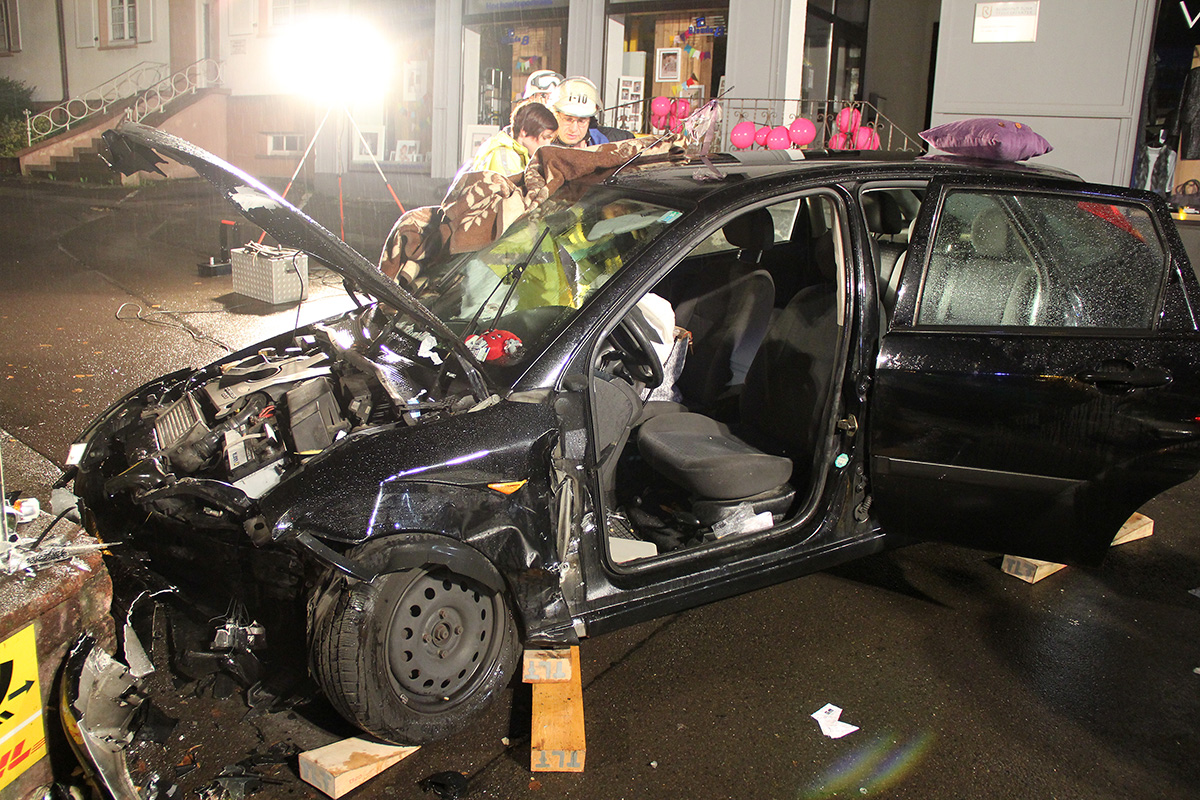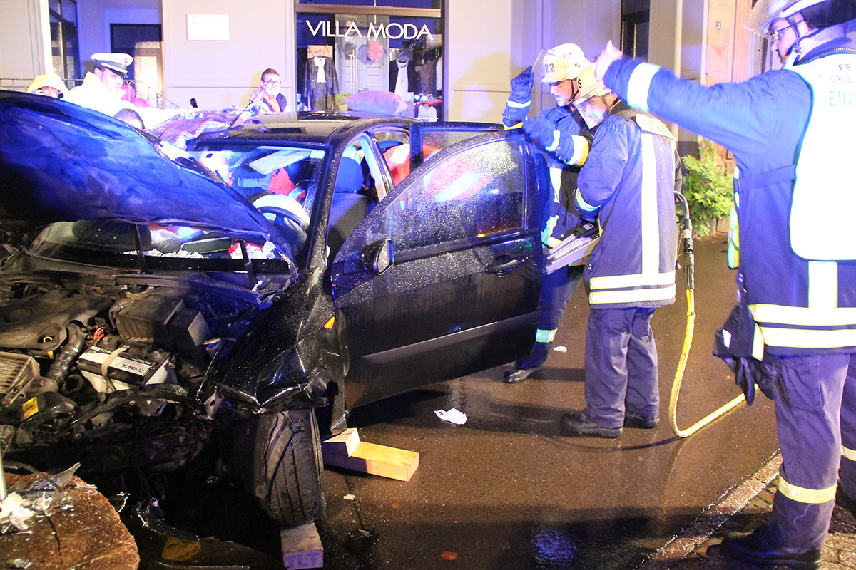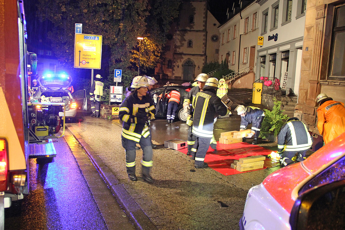 Eine 48jährige Fahrerin befuhr in den frühen Morgenstunden des 19. September 2015 die B10 aus Richtung Lebach kommend, als sie in Höhe der Einmündung Kossmannstraße die Kontrolle über ihr Fahrzeug verlor. Sie prallte erst gegen eine Granittreppe und dann frontal gegen eine Mauer. Das Fahrzeug blieb in der Zufahrt zur Pfarrkirche stehen. Die Fahrerin war ansprechbar, konnte das Fahrzeug aber nicht mehr aus eigener Kraft verlassen.
