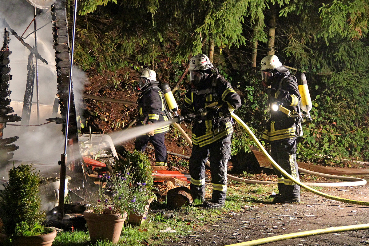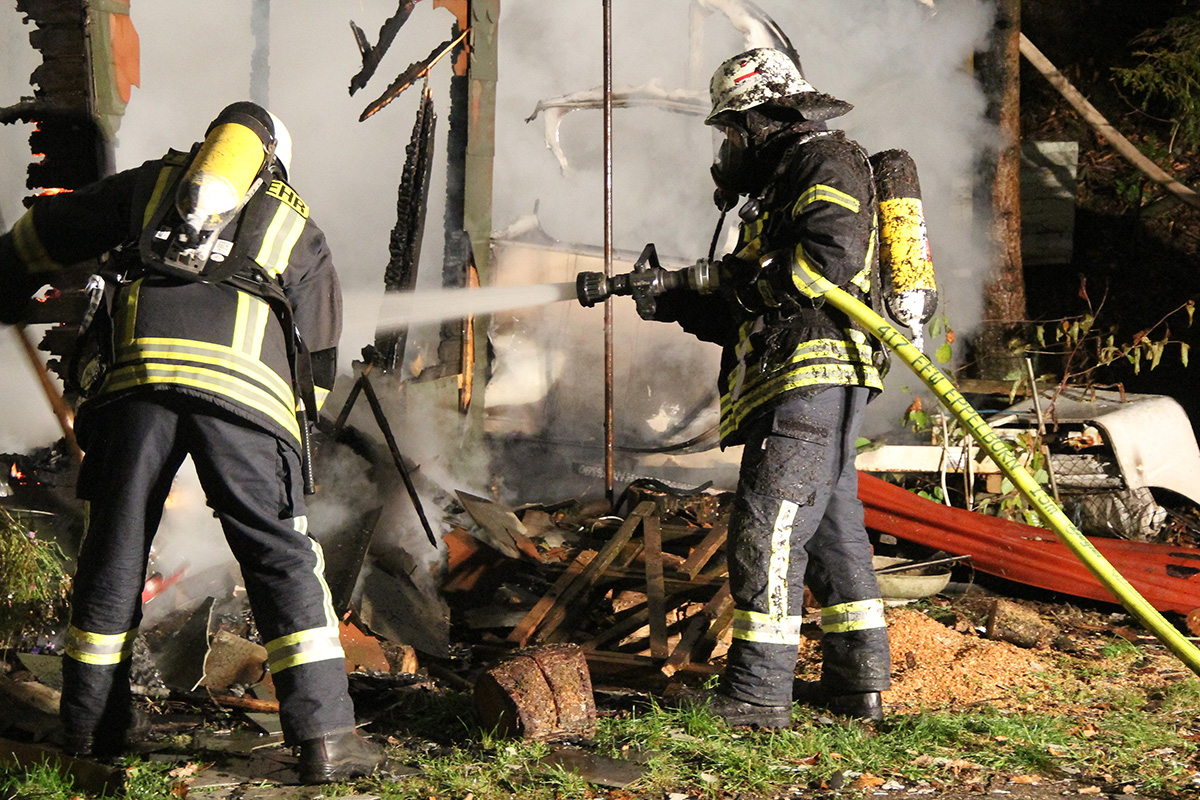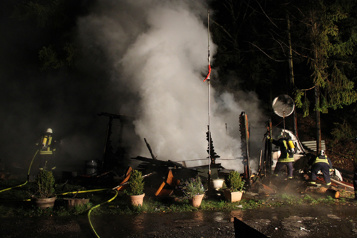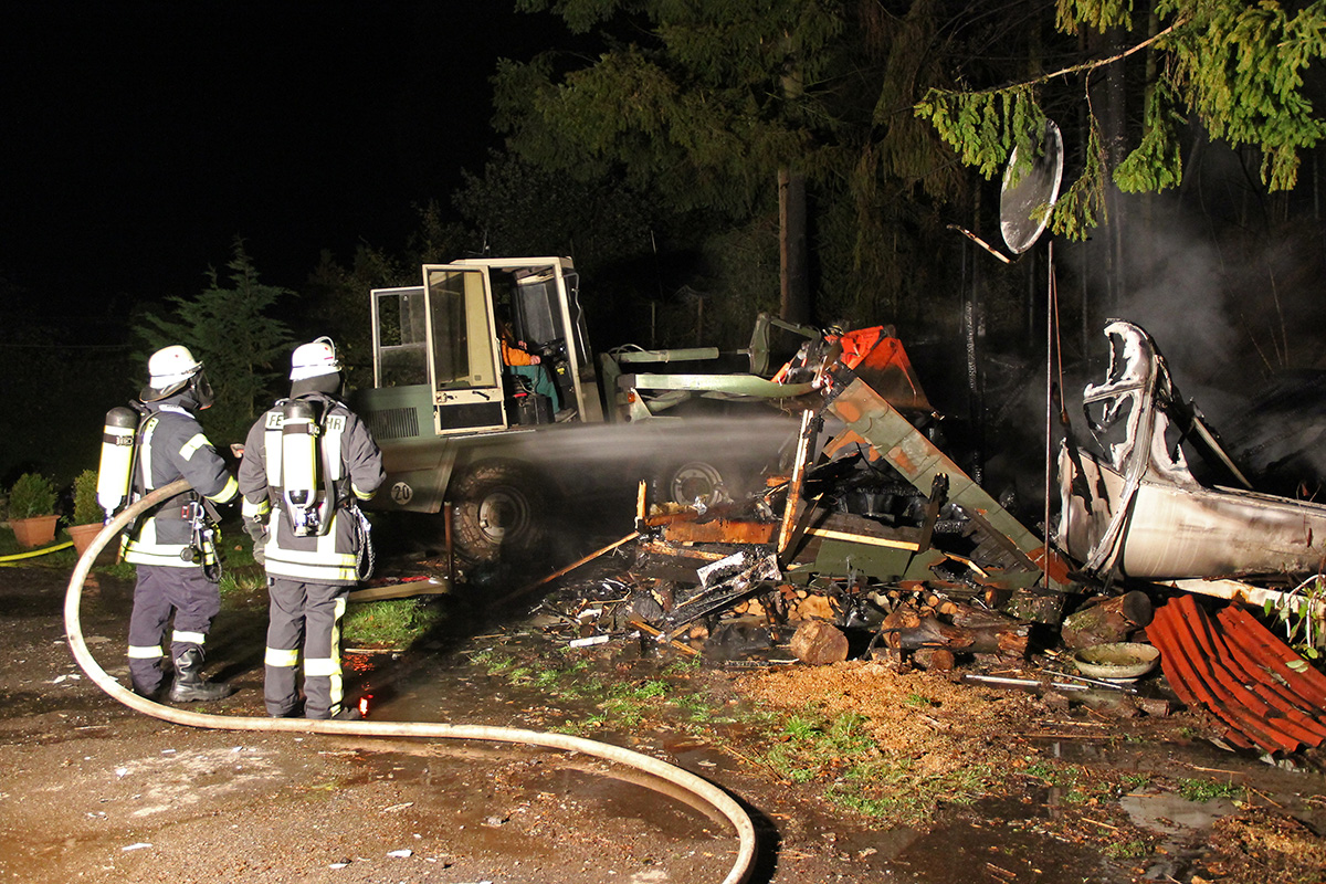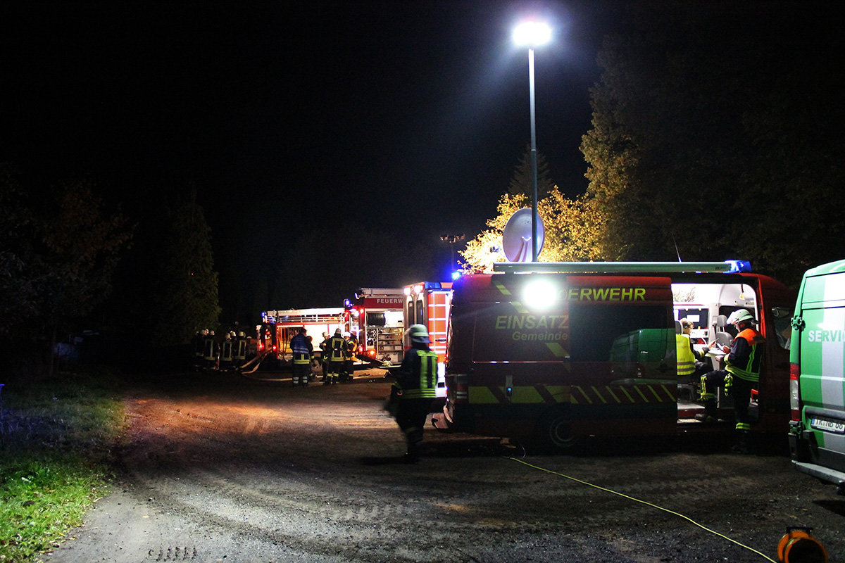 Beim Eintreffen der Feuerwehr nur wenige Minuten nach der Alarmierung stand der Wohnwagen sowie ein hölzerner Vorbau bereits im Vollbrand. Das Feuer drohte, auf den sich unmittelbar anschließenden Wald auszubreiten. Unter schwerem Atemschutz gingen die Einsatzkräfte gegen die Flammen vor. Unterdessen wurde an einem im unmittelbarer Nähe gelegenen Weiher eine Pumpe zur Wasserversorgung in Stellung gebracht.