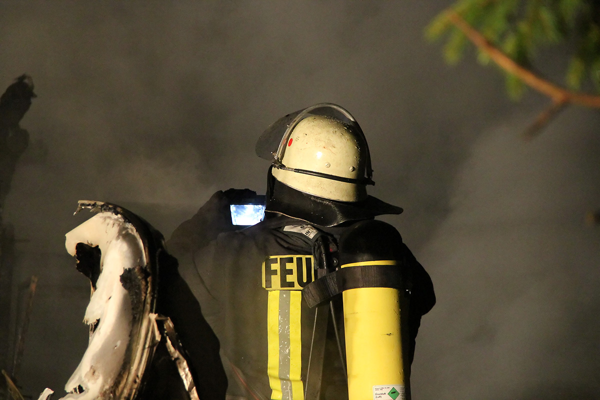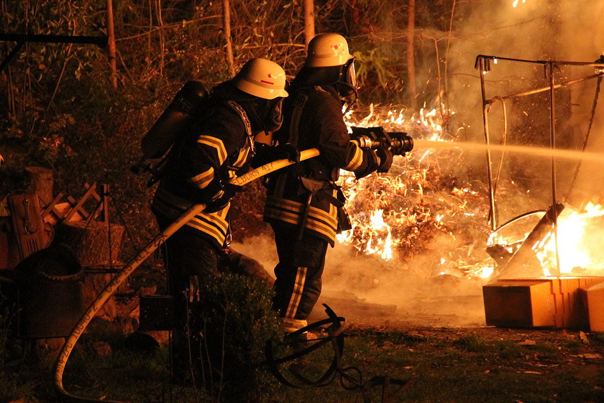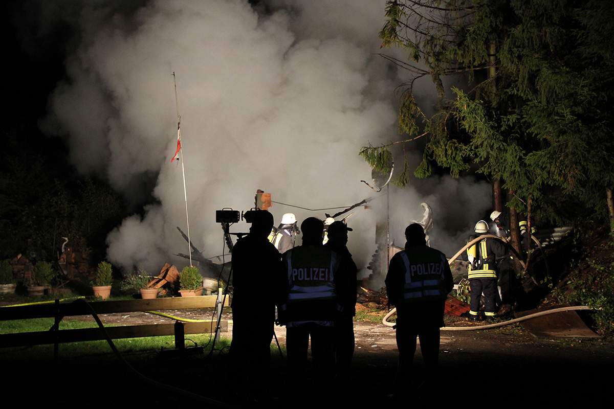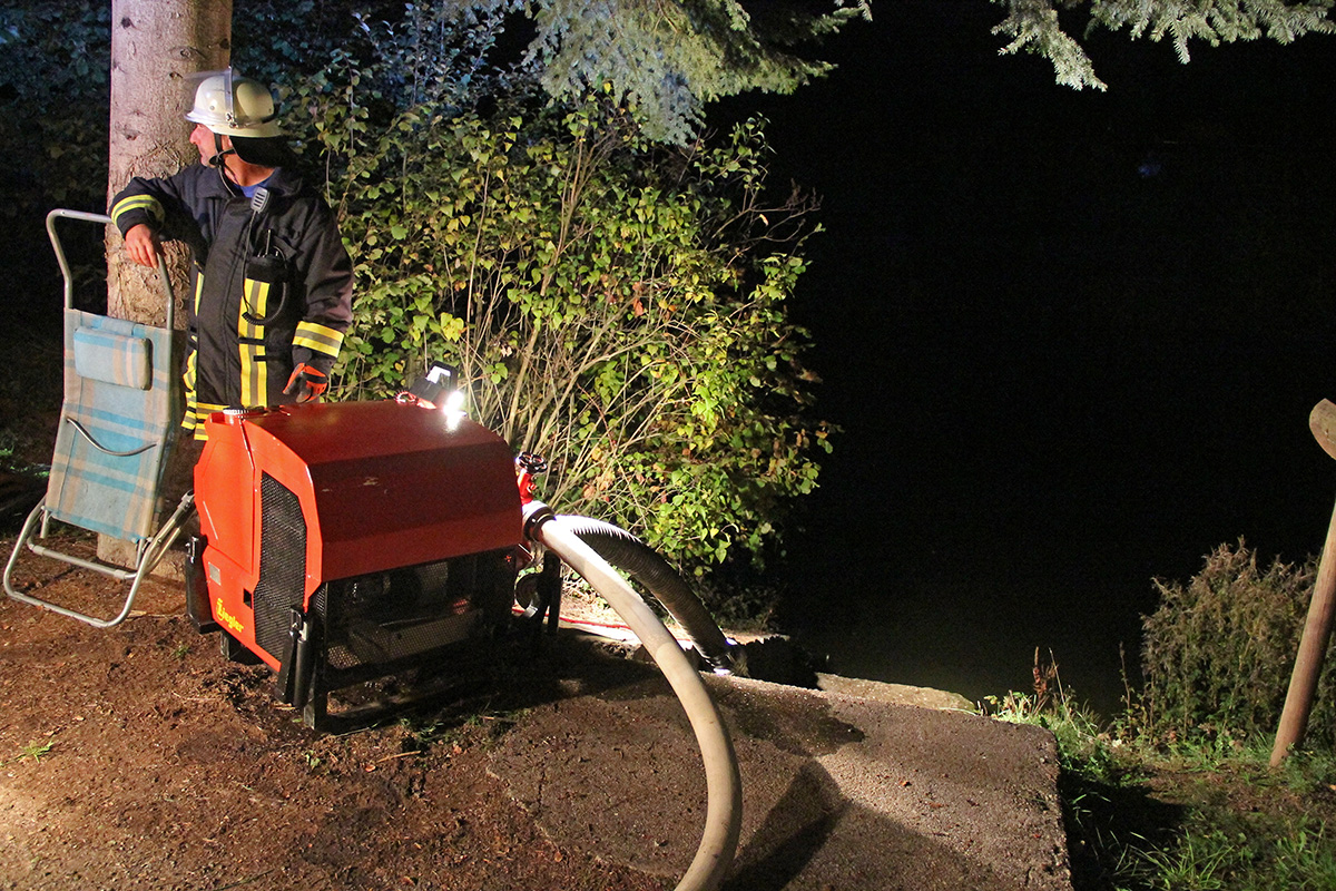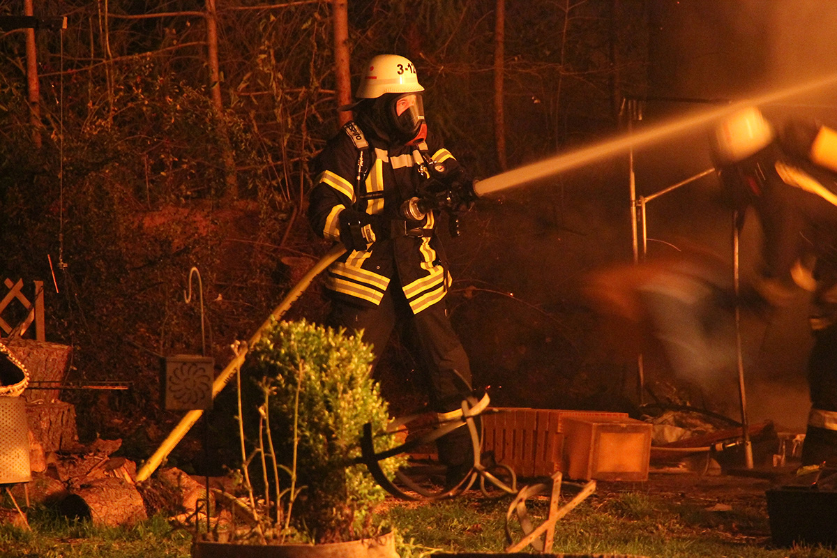 Beim Eintreffen der Feuerwehr nur wenige Minuten nach der Alarmierung stand der Wohnwagen sowie ein hölzerner Vorbau bereits im Vollbrand. Das Feuer drohte, auf den sich unmittelbar anschließenden Wald auszubreiten. Unter schwerem Atemschutz gingen die Einsatzkräfte gegen die Flammen vor. Unterdessen wurde an einem im unmittelbarer Nähe gelegenen Weiher eine Pumpe zur Wasserversorgung in Stellung gebracht.