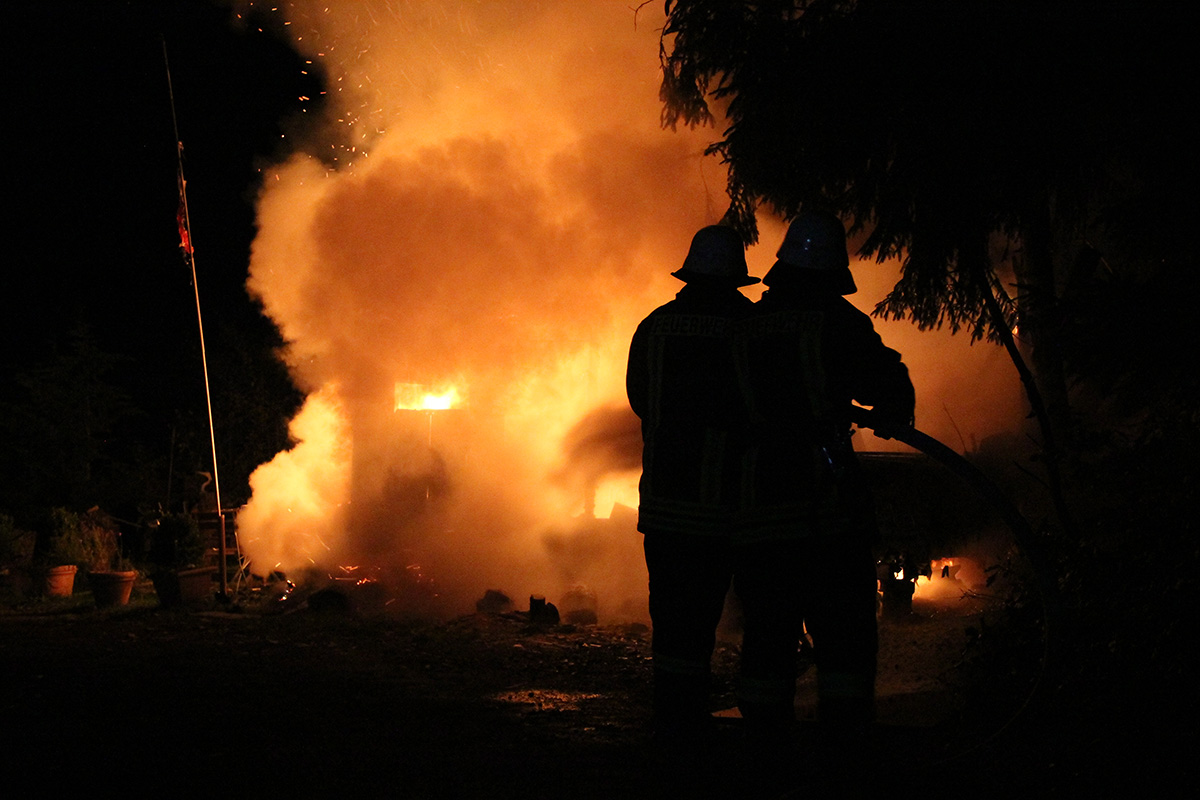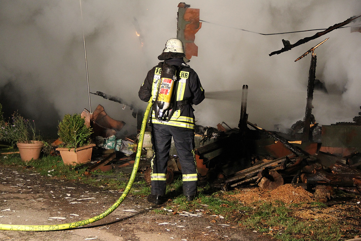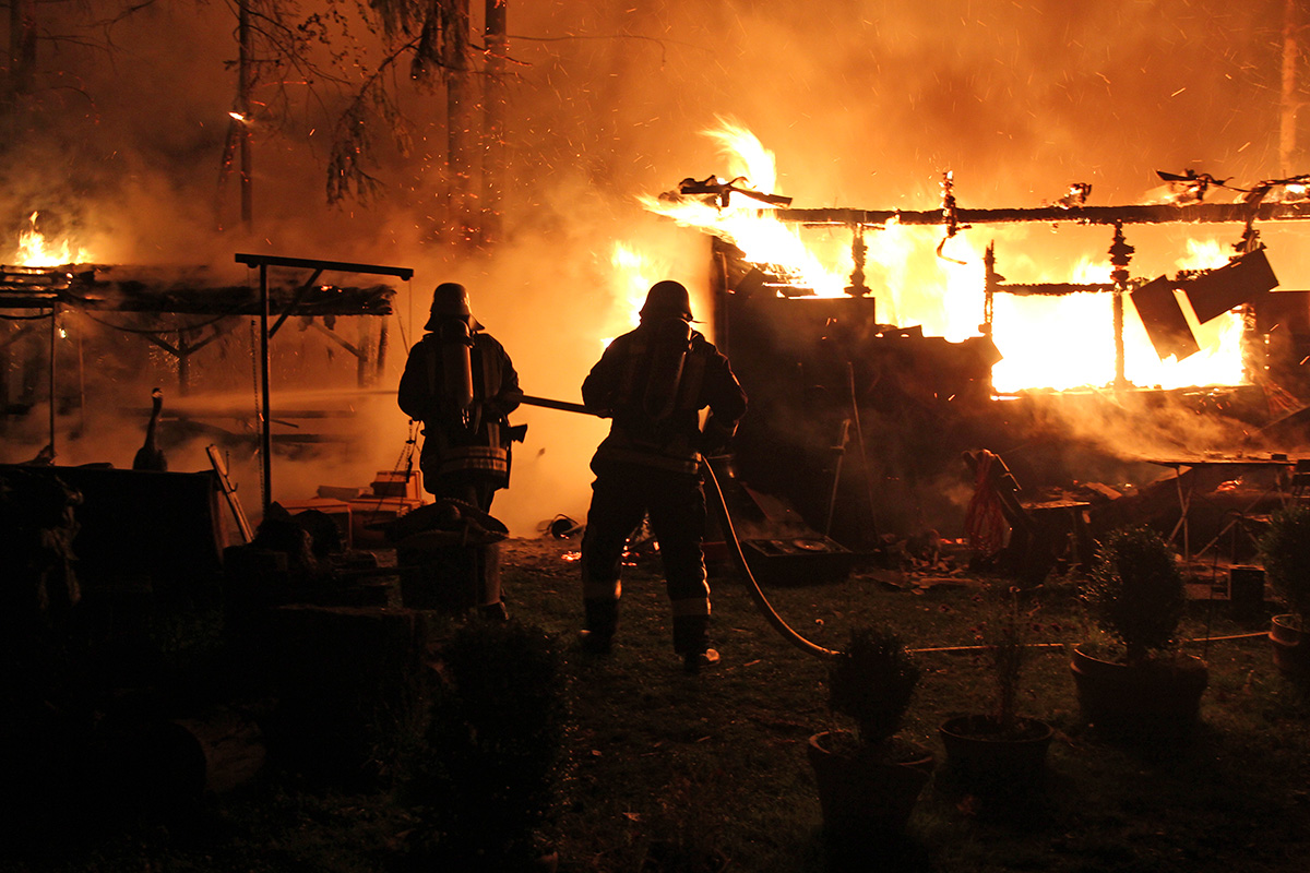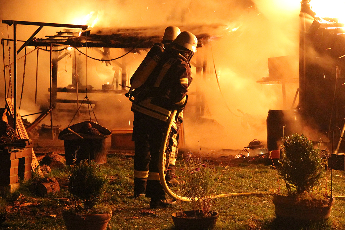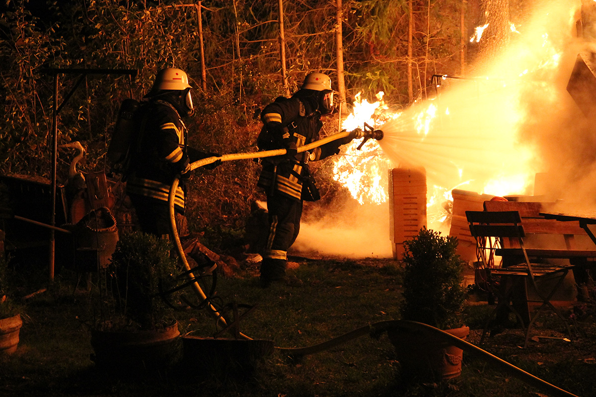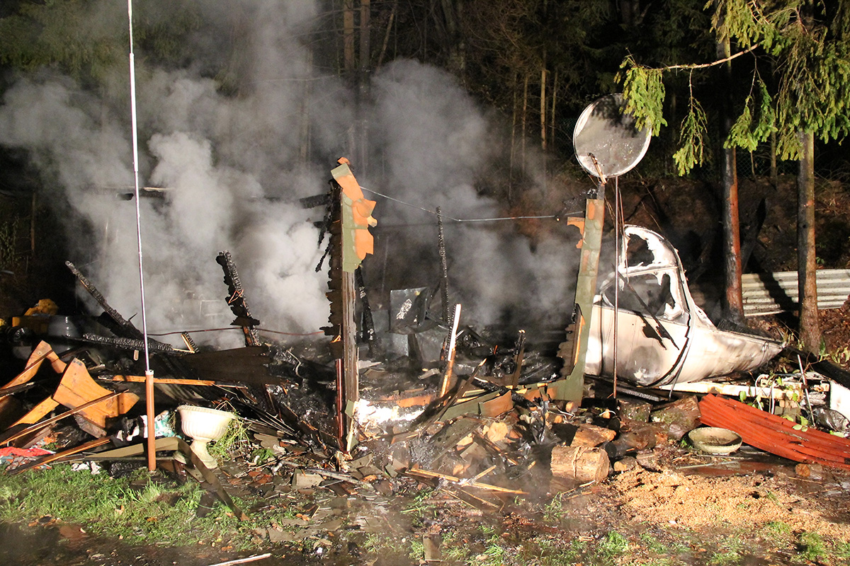 Beim Eintreffen der Feuerwehr nur wenige Minuten nach der Alarmierung stand der Wohnwagen sowie ein hölzerner Vorbau bereits im Vollbrand. Das Feuer drohte, auf den sich unmittelbar anschließenden Wald auszubreiten. Unter schwerem Atemschutz gingen die Einsatzkräfte gegen die Flammen vor. Unterdessen wurde an einem im unmittelbarer Nähe gelegenen Weiher eine Pumpe zur Wasserversorgung in Stellung gebracht.