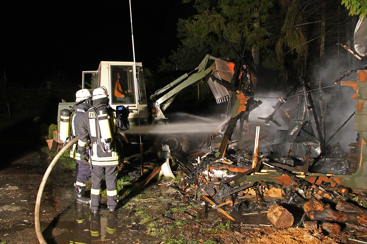 Zu Nachlöscharbeiten mussten die Reste des Wohnwagens sowie des Anbaus mit einem Radlader des Platzwartes auseinander gezogen werden, um versteckte Glutnester zu erreichen. Dazu wurde die Einsatzstelle mehrfach mit der Wärmebildkamera kontrolliert.