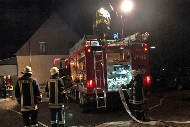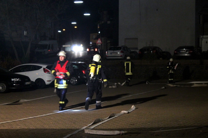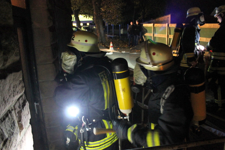 Neben dem Atemschutzeinsatz muss die Einsatzstelle wegen der Dunkelheit mit Scheinwerfern ausgeleuchtet werden. Mit 2 Rohren wird der angenommene Brand im Aussenangriff bekämpft. Auch eine Leiter wird in Stellung gebracht, um Menschen aus den oberen Stockwerken zu retten.