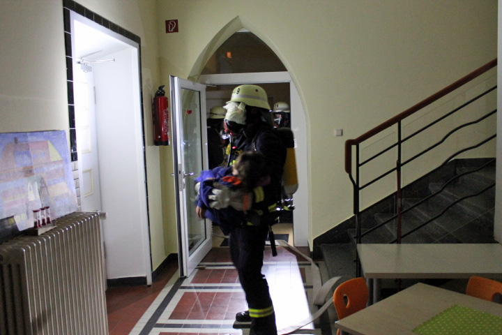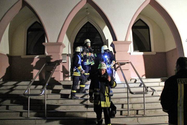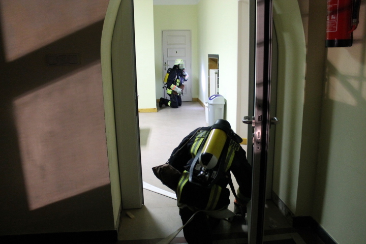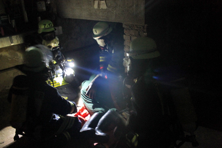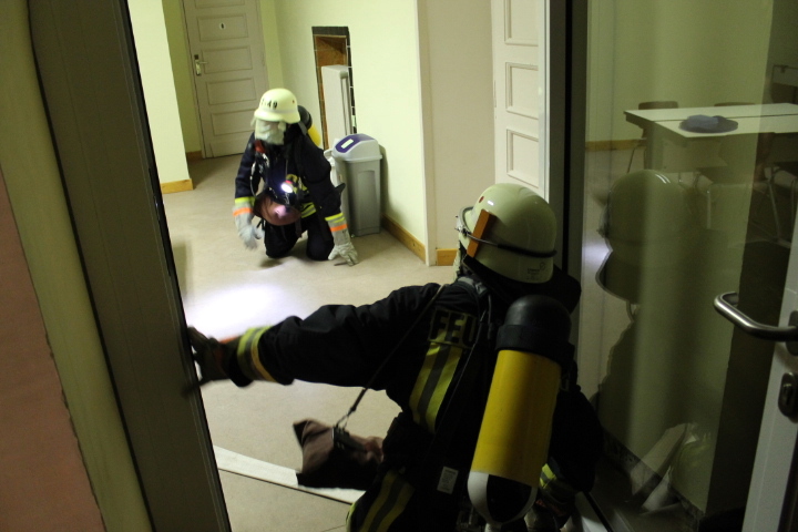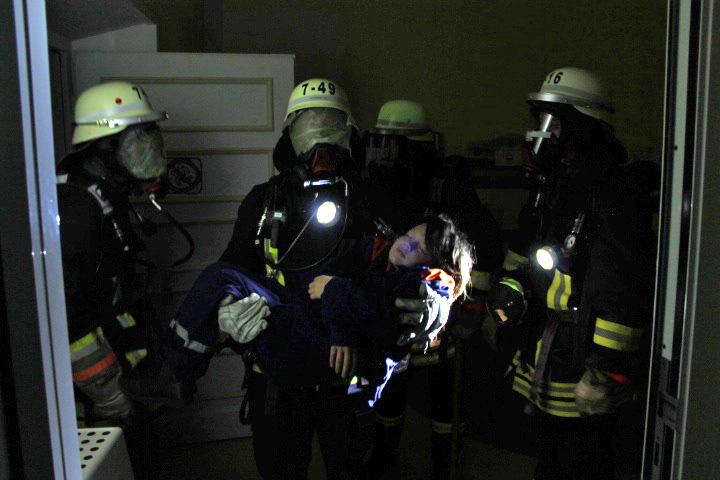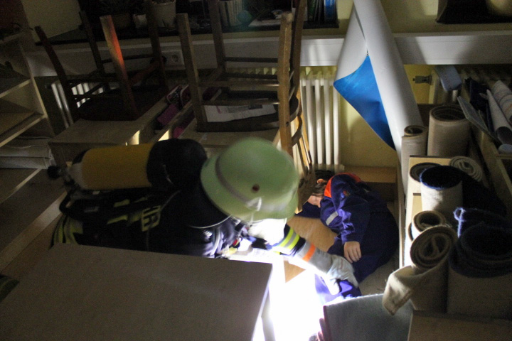 Das Ziel der Übung: Im gemeinsamen Übungseinsatz vor allem das Auffinden von vermissten Schülern bei schlechter Sicht zu trainieren. Damit nicht das gesamte Gebäude verraucht werden muss, werden die Atemschutzmasken der vorgehenden Trupps mit Folie abgeklebt. So präpariert müssen sich die Einsatzkräfte nur mit Tasten den Weg durch die Räume bahnen. Es gelingt ihnen, die drei vermissten Personen zu finden und ins Freie zu retten.