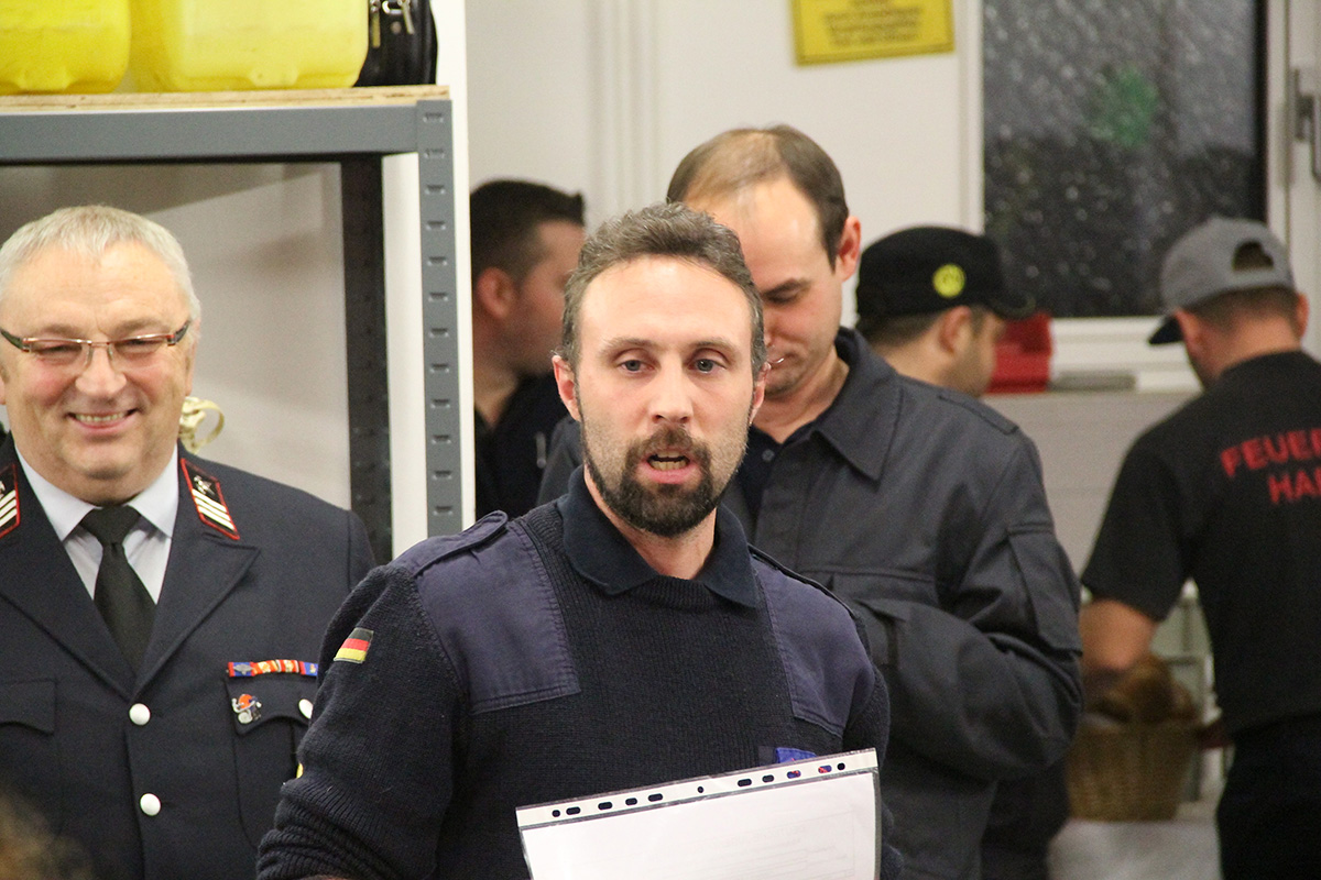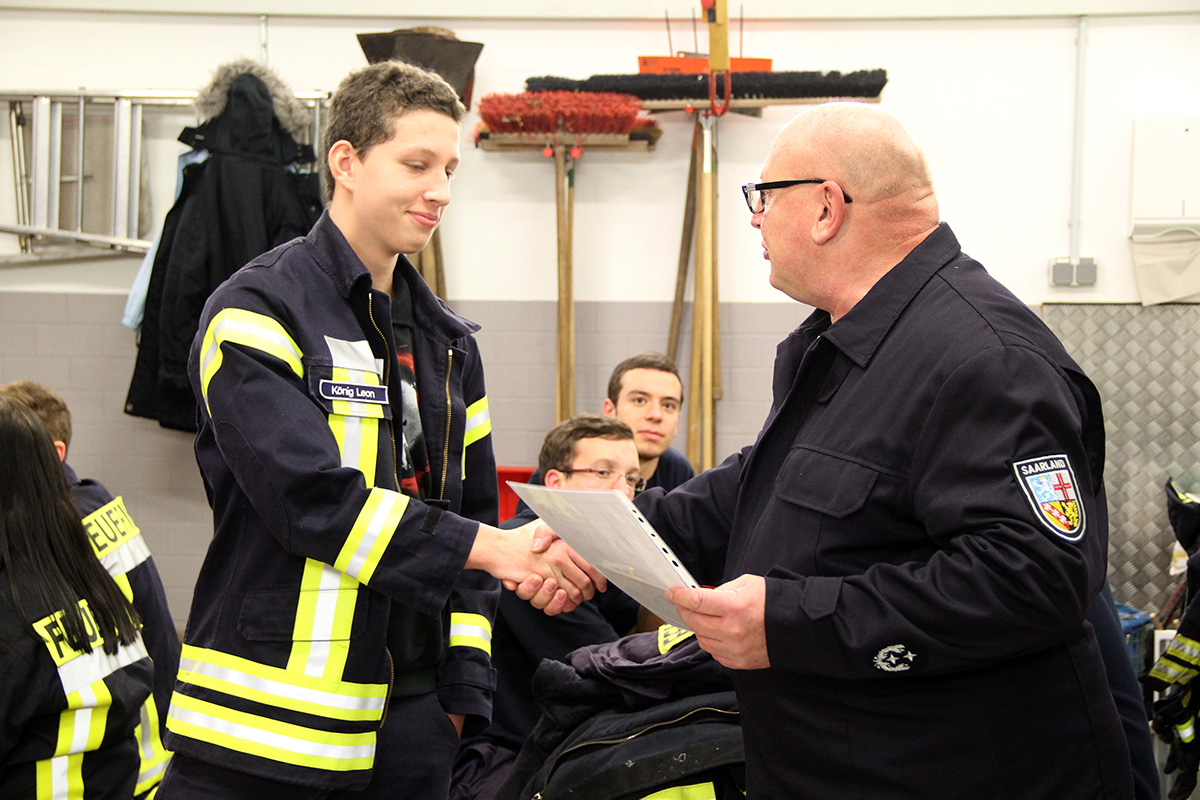 Wehrführer Klaus Theis, der auch gekommen war, nutze den Abend und konnte Leon König von der Jugendfeuerwehr in die aktive Einsatzabteilung des Löschbezirks Eppelborn aufnehmen. Nach einer Stärkung ging es dann wieder zurück in die Löschbezirke.