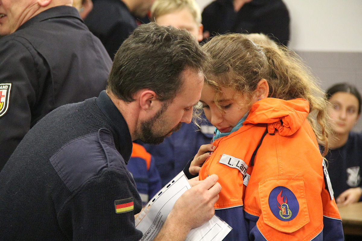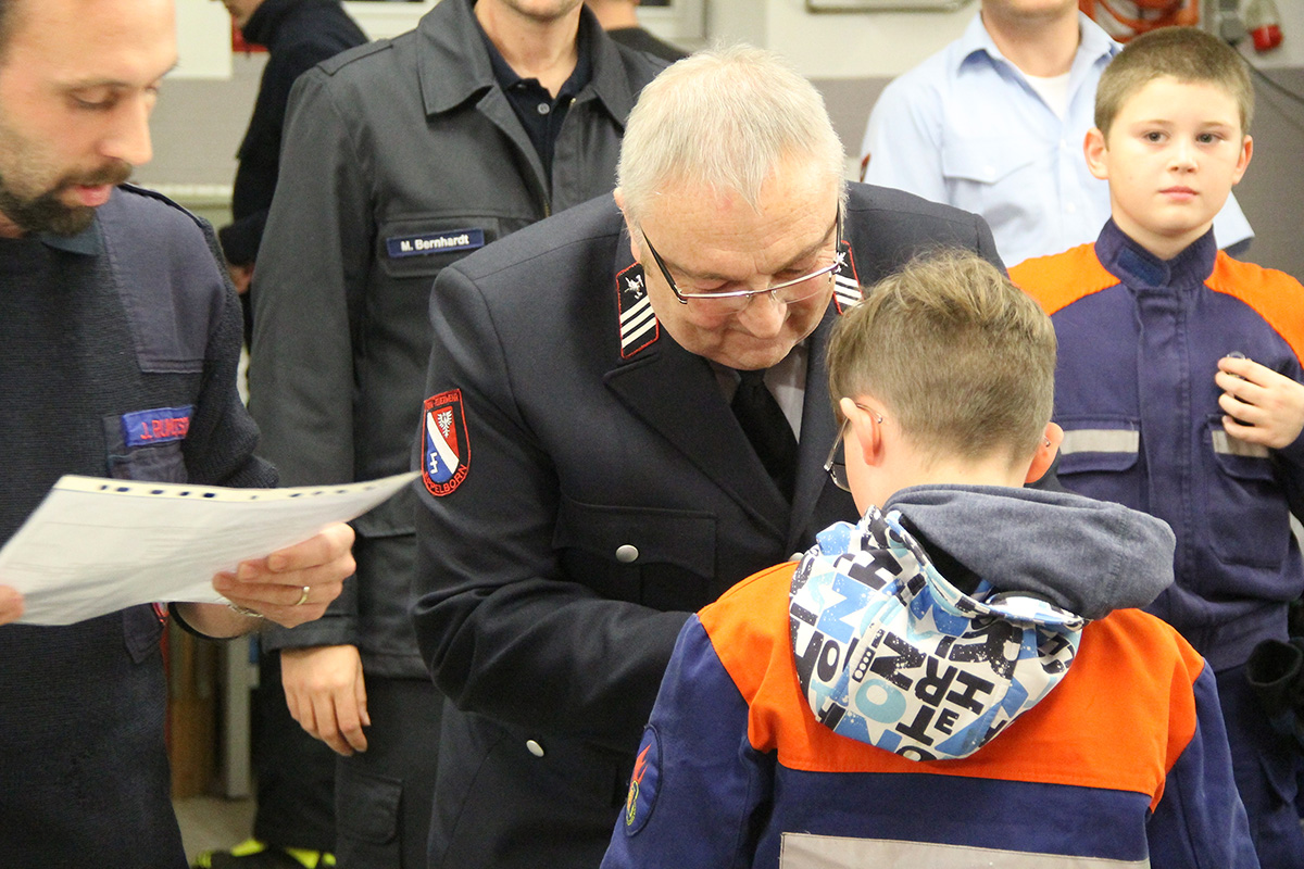 Dort wartete schon der Gemeindejugendbetreuer Karl Paul auf die Jugendlichen. Zusammen mit dem Kreisjugendbeauftragten Jan Rumetsch verlieh er dann die Jugendflamme der Stufe 1 an Noah Kleer, Jermaine Lamberty, Julian Breme, Leonhard Heinen, Luca Heinen, Simon Lang und Leanne Lambert. Die Jugendlichen hatten im vergangenen Monat die Aufgaben dieser Jugendfeuerwehr-Prüfung erfolgreich abgelegt und erhielten jetzt mit der Auszeichnung jetzt die Bestätigung ihrer erfolgreichen Teilnahme.
