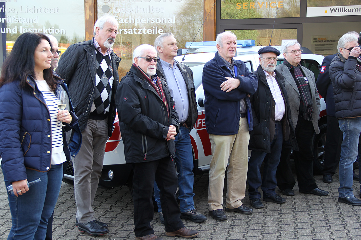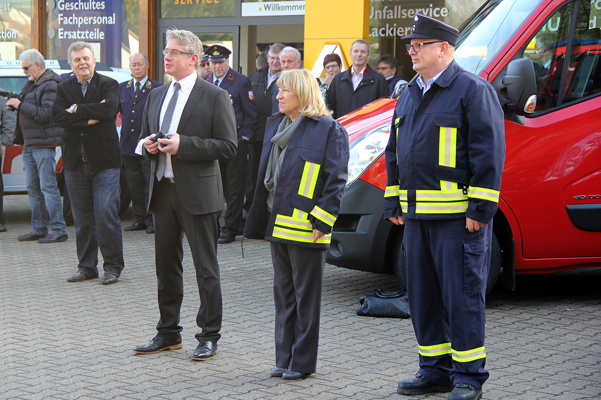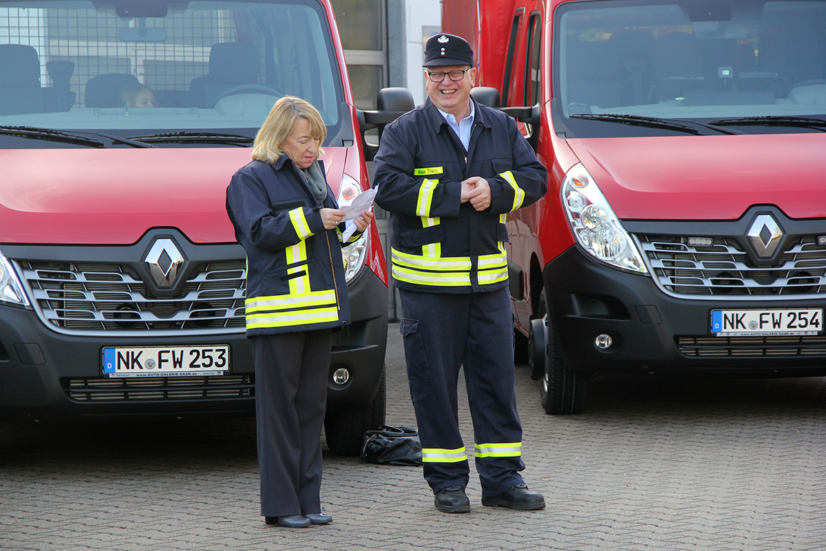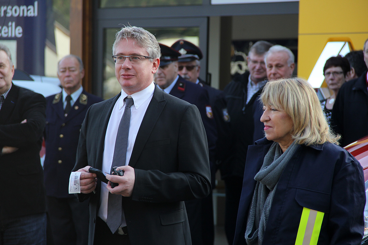 Mit rund einer Stunde Verspätung konnte die Fahrzeugübergabe dann doch noch stattfinden. Müller-Closset nahm die Fahrzeugschlüssel für den neuen Kommandowagen, ein Mannschaftstransportfahrzeug und ein Mehrzweckfahrzeug von Peter Hammerschmitt, dem Geschäftsführer der "Auto Galerie Saar" in Empfang und reichte sie gleich weiter an die Löschbezirksführer von Eppelborn und Hierscheid sowie an Wehrführer Klaus Theis.