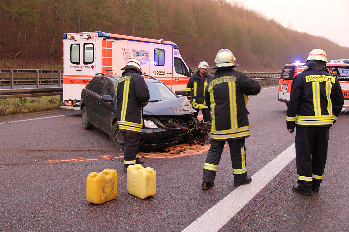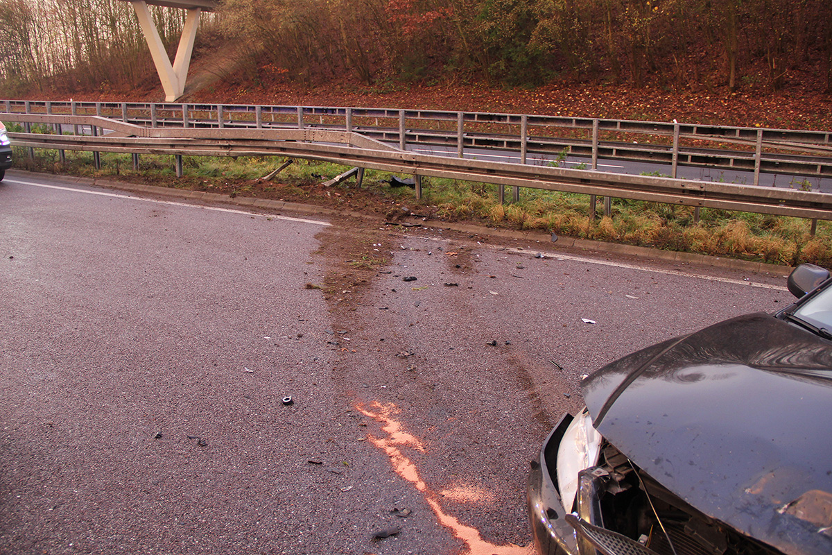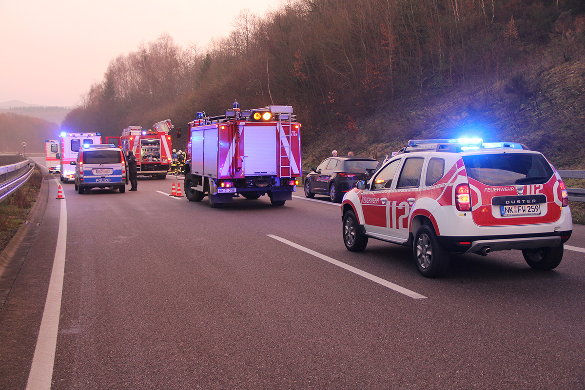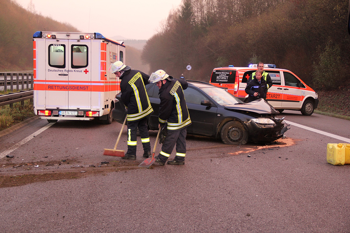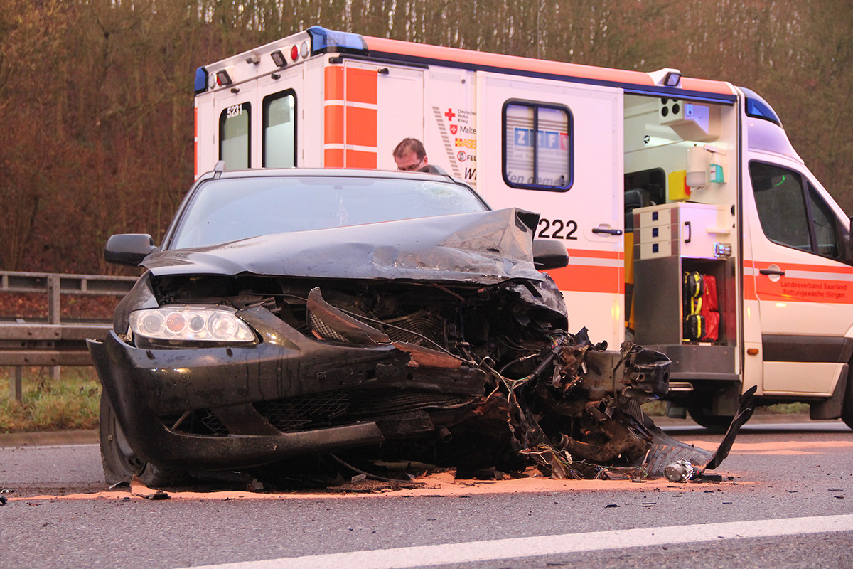 Ein 23 Jähriger fuhr am Morgen des 20. Dezember 2015 auf der Autobahn A1 in Fahrtrichtung Trier, als er kurz vor der Anschlussstelle Tholey die Kontrolle über sein Fahrzeug verlor und mit hoher Geschwindigkeit gegen die Mittelleitplanke prallte. Das Fahrzeug drehte sich und blieb quer zur Fahrbahn auf beiden Fahrspuren stehen.