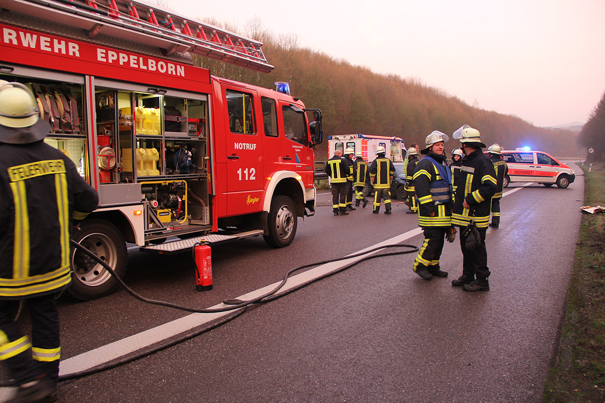 Nachfolgende Autofahrer befreiten den jungen Mann, der zuerst nicht ansprechbar war, aus dem Fahrzeug und wählten den Notruf. Da aus den ersten Angaben nicht genau hervor ging, ob der Fahrer noch in seinem Fahrzeug eingeklemmt ist, wurden von der Rettungsleitstelle daraufhin neben Polizei und Rettungsdienst auch die Feuerwehr aus den Löschbezirken Eppelborn, Hierscheid und Bubach-Calmesweiler alarmiert.