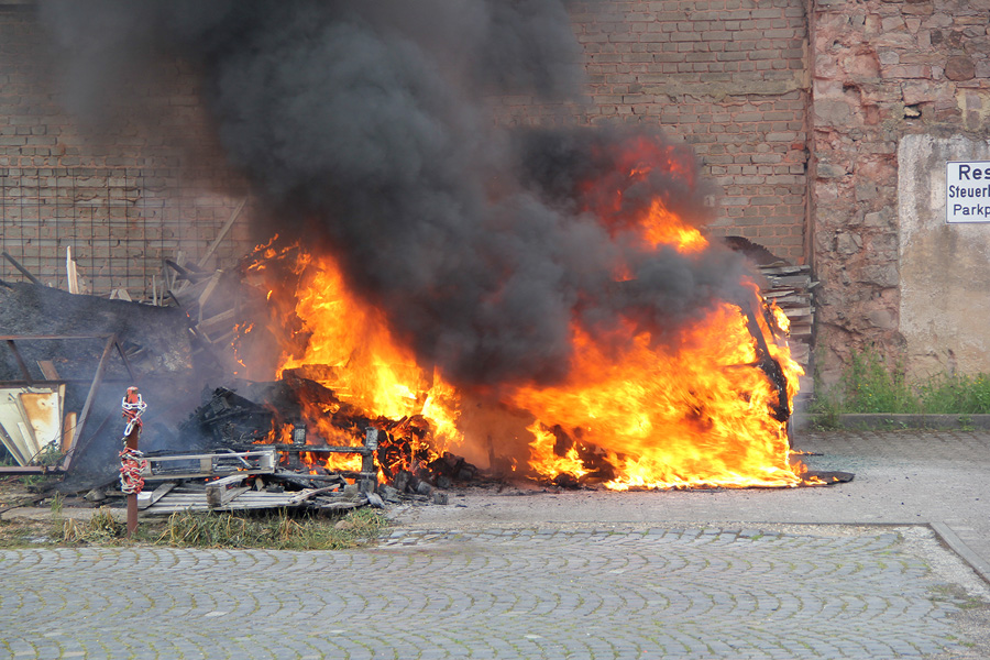 Dichter Rauch steigt am Vormittag des 09. Mai 2015 hinter einem Geschäftshaus am Kirchplatz in…