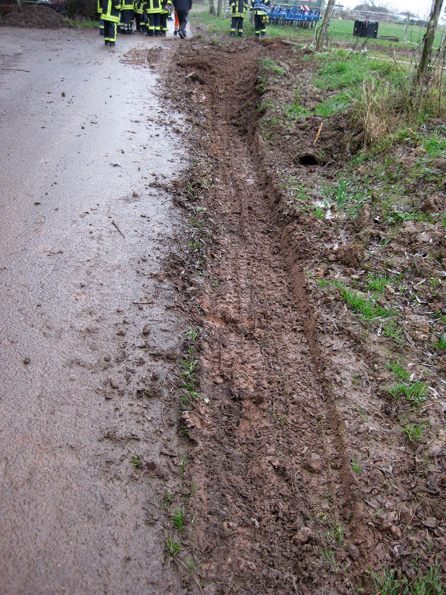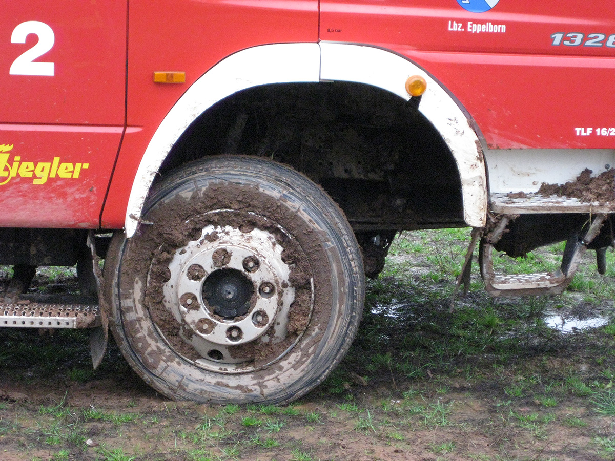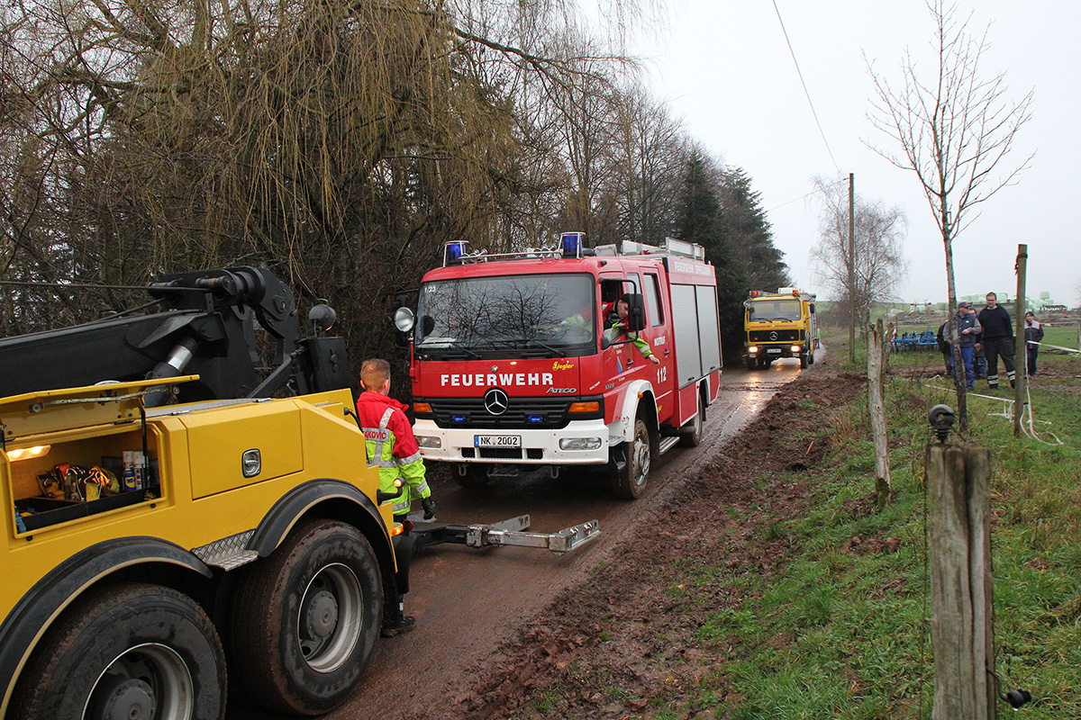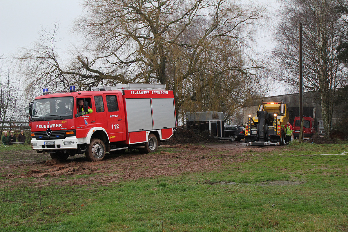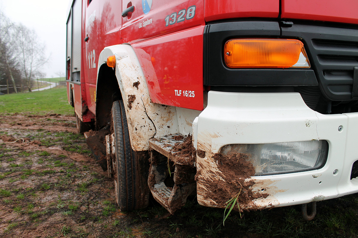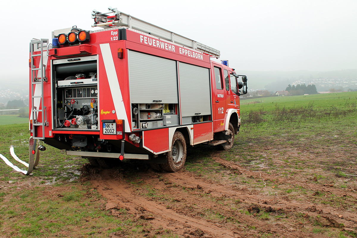 Auf dem Weg zum Einsatz ist am Morgen des 02. Januar 2016 das Tanklöschfahrzeug aus dem Löschbezirk Eppelborn verunfallt. Die Feuerwehr war alarmiert worden, weil ein Hund im Bereich der Autobahnbrücke in der Verlängerung der Galgenbergstraße in einem Abwasserrohr feststecken sollte. In Höhe des Berghofes musste der Fahrer des rund 14 Tonnen schweren Einsatzfahrzeugs Ästen ausweichen und kam dabei mit den Rädern auf den Seitenstreifen. Dort waren vor Kurzem erst die Leitungen zur neuen Windenergieanlage verlegt worden und man hatte es offenbar versäumt, das wiederverfüllte Erdreich fachgerecht zu verdichten. Deshalb sackte das Löschfahrzeug ein und geriet ausser Kontrolle. Der Fahrer reagierte richtig und versuchte, das Fahrzeug auf den angrenzenden Acker zu lenken. Er konnte damit verhinderten, dass das mit neun Einsatzkräften besetzte Einsatzfahrzeug umkippte. Durch den Unfall entstand im Bereich der Vorderachse ein massiver Unfallschaden. Die verladene Ausrüstung musste vor Ort in einen Gerätewagen umgeladen werden. Die Bergung des Löschfahrzeugs musste eine Spezialfirma übernehmen. Verletzt wurde durch die besonnene Reaktion des Fahrers glücklicherweise niemand. Das für den Brandschutz und die technische Hilfeleistung wichtige Fahrzeug musste ausser Dienst genommen werden. In der kommenden Woche wird ein Gutachter den Schaden bewerten. Zur Zeit ist noch unklar, ob das Fahrzeug repariert werden kann oder ob es sich um einen Totalschaden handelt. Für die Zeit, in der das Tanklöschfahrzeug nicht zur Verfügung steht, wurde die Alarm- und Ausrückeordnung angepasst, so dass die Feuerwehren aus Illingen und Lebach mit vergleichbaren Fahrzeugen aushelfen werden.