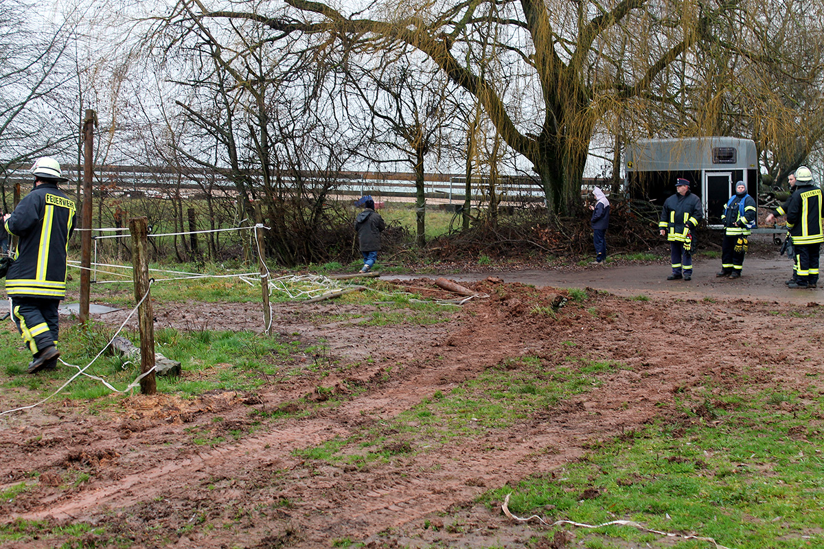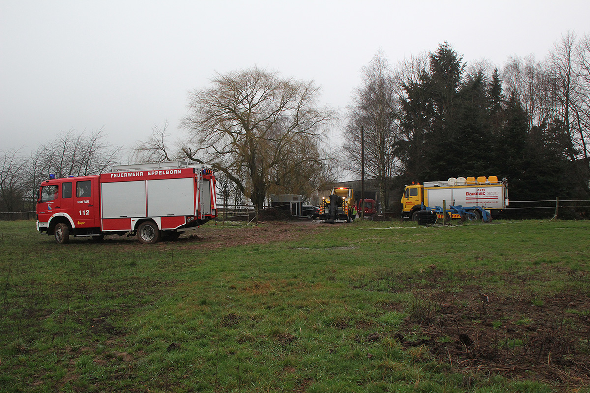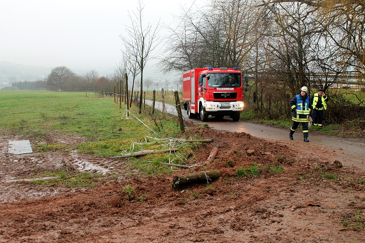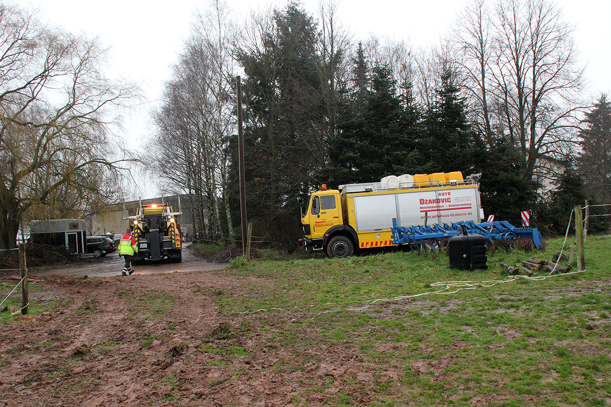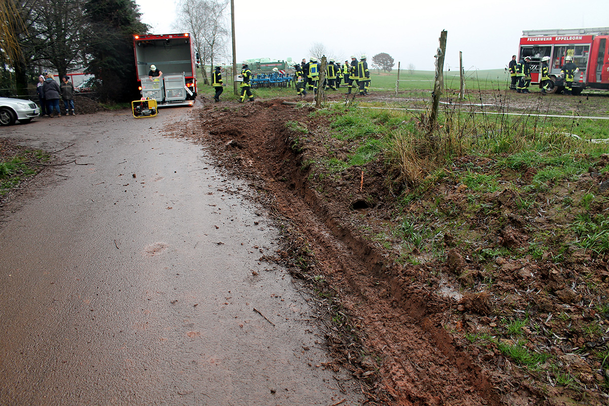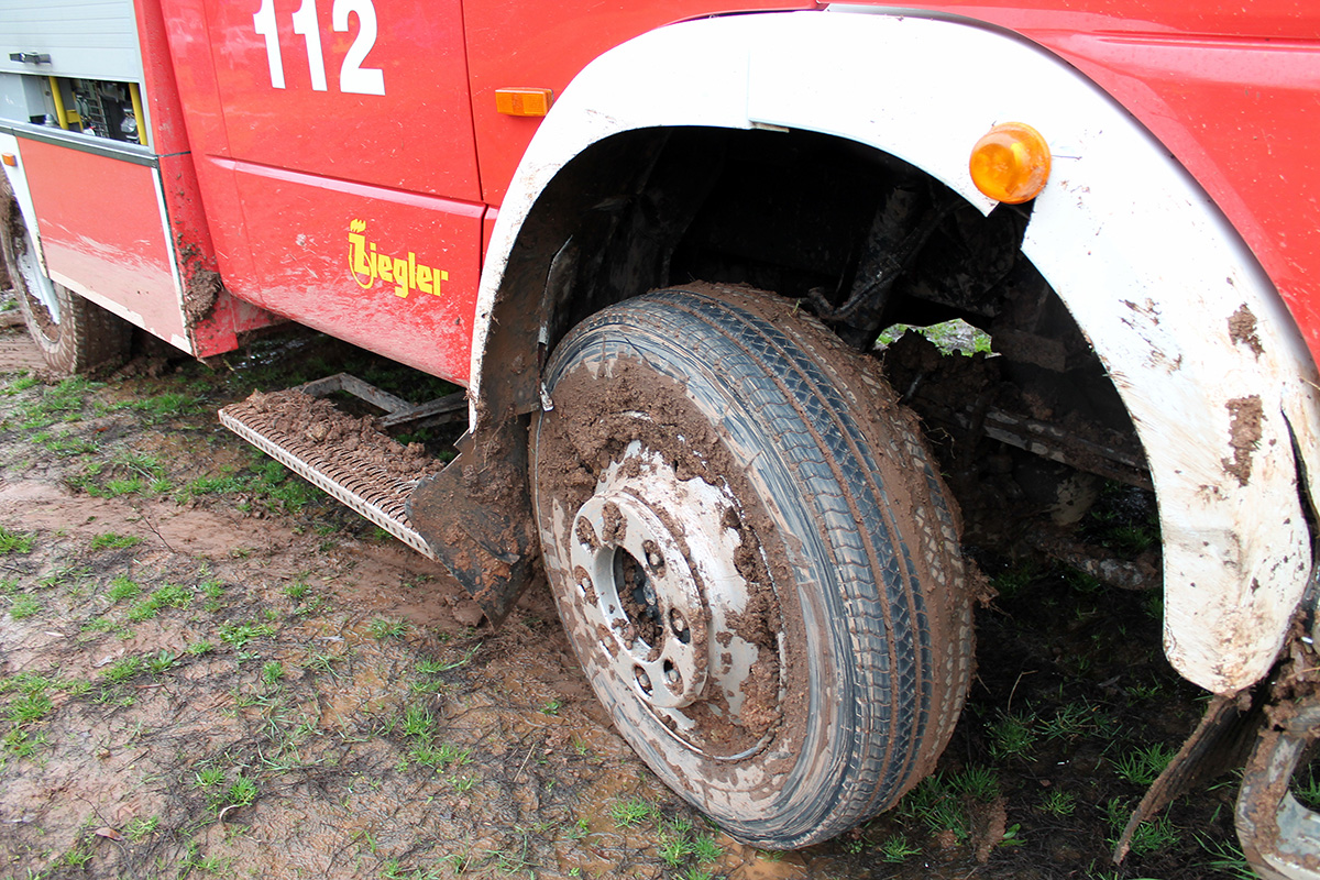 Auf dem Weg zum Einsatz ist am Morgen des 02. Januar 2016 das Tanklöschfahrzeug aus dem Löschbezirk Eppelborn verunfallt. Die Feuerwehr war alarmiert worden, weil ein Hund im Bereich der Autobahnbrücke in der Verlängerung der Galgenbergstraße in einem Abwasserrohr feststecken sollte. In Höhe des Berghofes musste der Fahrer des rund 14 Tonnen schweren Einsatzfahrzeugs Ästen ausweichen und kam dabei mit den Rädern auf den Seitenstreifen. Dort waren vor Kurzem erst die Leitungen zur neuen Windenergieanlage verlegt worden und man hatte es offenbar versäumt, das wiederverfüllte Erdreich fachgerecht zu verdichten. Deshalb sackte das Löschfahrzeug ein und geriet ausser Kontrolle. Der Fahrer reagierte richtig und versuchte, das Fahrzeug auf den angrenzenden Acker zu lenken. Er konnte damit verhinderten, dass das mit neun Einsatzkräften besetzte Einsatzfahrzeug umkippte. Durch den Unfall entstand im Bereich der Vorderachse ein massiver Unfallschaden. Die verladene Ausrüstung musste vor Ort in einen Gerätewagen umgeladen werden. Die Bergung des Löschfahrzeugs musste eine Spezialfirma übernehmen. Verletzt wurde durch die besonnene Reaktion des Fahrers glücklicherweise niemand. Das für den Brandschutz und die technische Hilfeleistung wichtige Fahrzeug musste ausser Dienst genommen werden. In der kommenden Woche wird ein Gutachter den Schaden bewerten. Zur Zeit ist noch unklar, ob das Fahrzeug repariert werden kann oder ob es sich um einen Totalschaden handelt. Für die Zeit, in der das Tanklöschfahrzeug nicht zur Verfügung steht, wurde die Alarm- und Ausrückeordnung angepasst, so dass die Feuerwehren aus Illingen und Lebach mit vergleichbaren Fahrzeugen aushelfen werden.