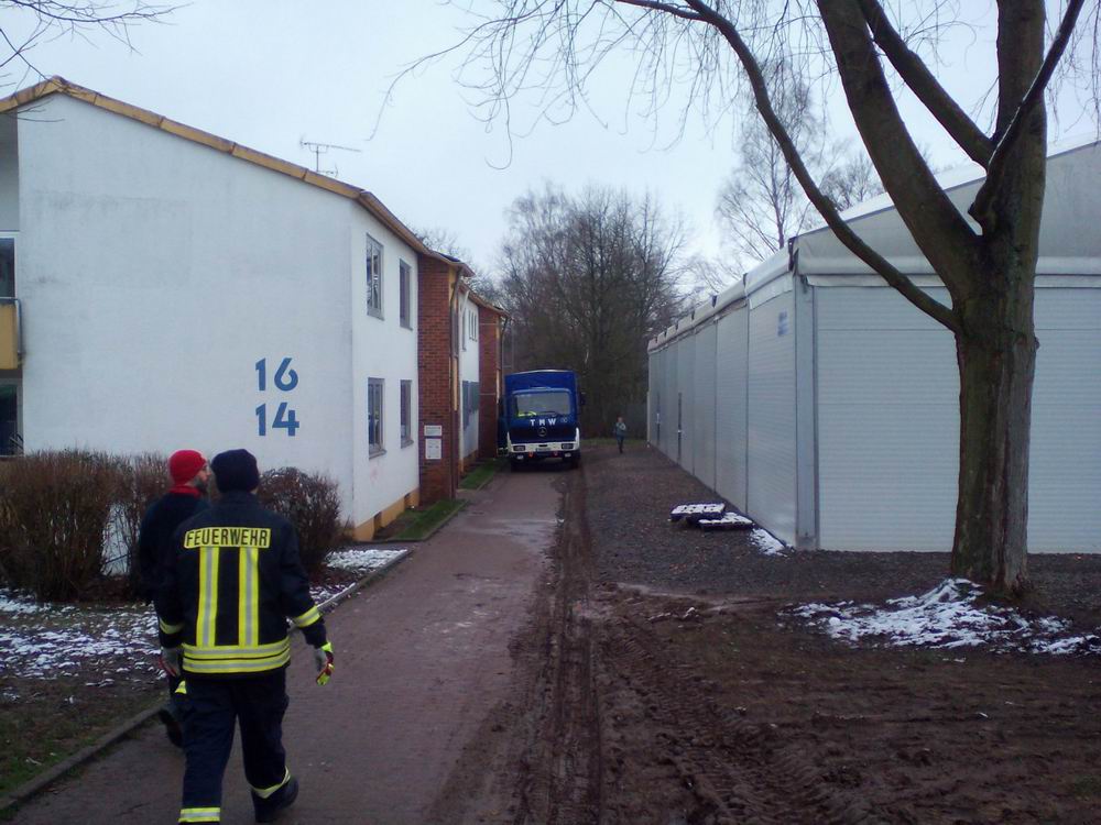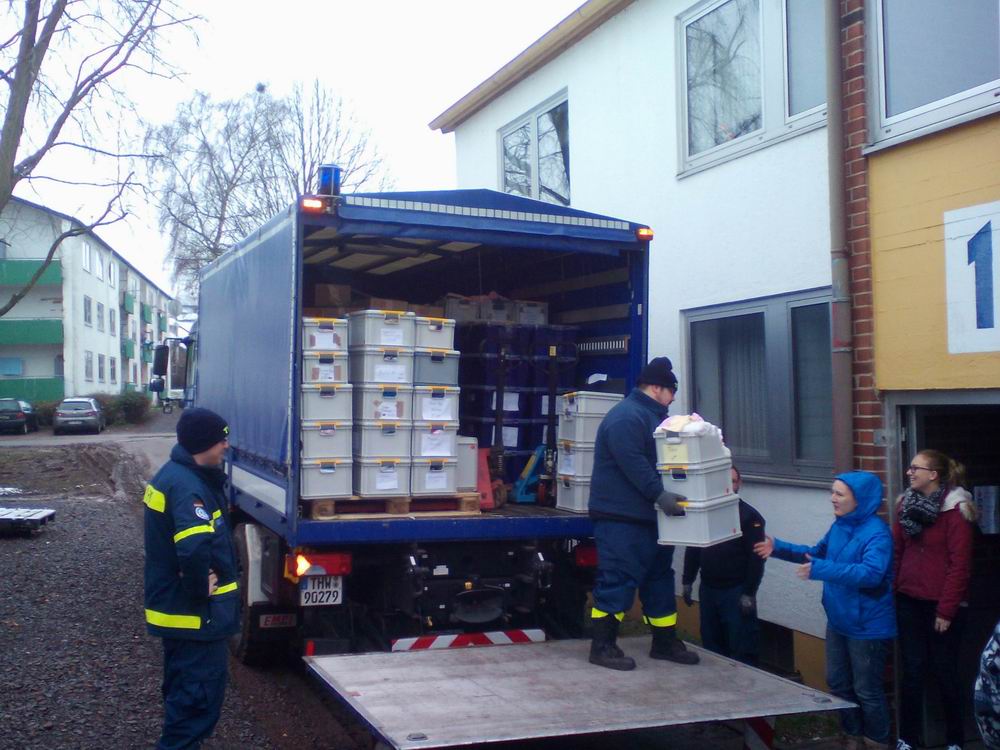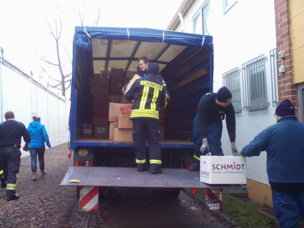 In einem ehemaligen Möbellager in der Juchemstraße in Eppelborn befand sich die Kleiderkammer für Flüchtlinge. Diese Kleiderkammer, welche durch ehrenamtliche Helferinnen- und Helfern betrieben wurde, musste jetzt unter anderem aus energetischen Gründen geräumt und nach Lebach umgezogen werden. Da absehbar war, dass dies sehr arbeits- und zeitintensiv sein wird, baten die ehrenamtlichen Helfer dieser Einrichtung die Feuerwehr der Gemeinde Eppelborn um Hilfe. Am Samstag, den 16. Januar 2016 waren, neben den Helferinnen und Helfern der Kleiderkammer und Helfern des Technischen Hilfswerkes mit mehreren LKWs auch 8 Kameraden des Löschbezirks Bubach-Calmesweiler und 1 Kamerad aus dem Löschbezirk Eppelborn zur Stelle, um tatkräftig zu helfen. In dem Lager, in welchem eine Vielzahl von Kleidungsstücken in Kartons gelagert werden, wurden diese auf Euro Paletten verladen, mit Klebeband gesichert und mittels Hubwagen in die LKWs des THW verladen. Diese wurden dann in die Landesaufnahmeeinrichtung nach Lebach transportiert und dort in Kellerräume eingelagert. Beim Entladen und einräumen der Kleidung halfen hier auch zahlreiche Flüchtlinge sowie ehrenamtlichen Helferinnen- und Helfer. So wurde das Projekt "Umzug der Kleiderkammer" Hand in Hand in die Tat umgesetzt. Für alle Beteiligten war es eine großartige Erfahrung mit viel Spaß. Aufgrund der Größe des Kleiderlagers werden weitere solcher Aktionen folgen. Ein Dank ergeht an die Helfer der Feuerwehr für ihre tatkräftige Unterstützung und deren Bereitschaft, nicht nur in einem Alarmfall für den Nächsten da zu sein. Ebenso an die ehrenamtlich Tätigen der Kleiderkammer für die Versorgung mit Essen und Getränken.