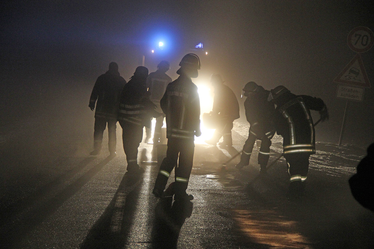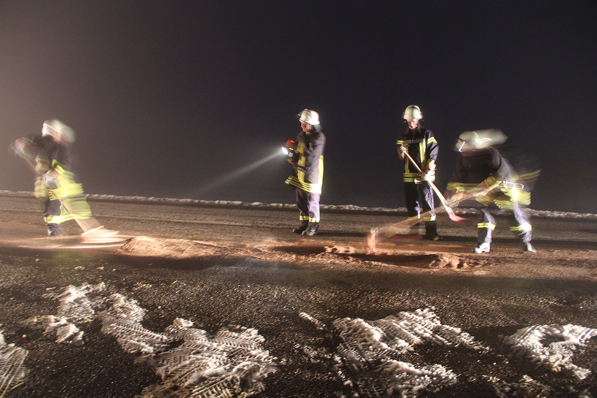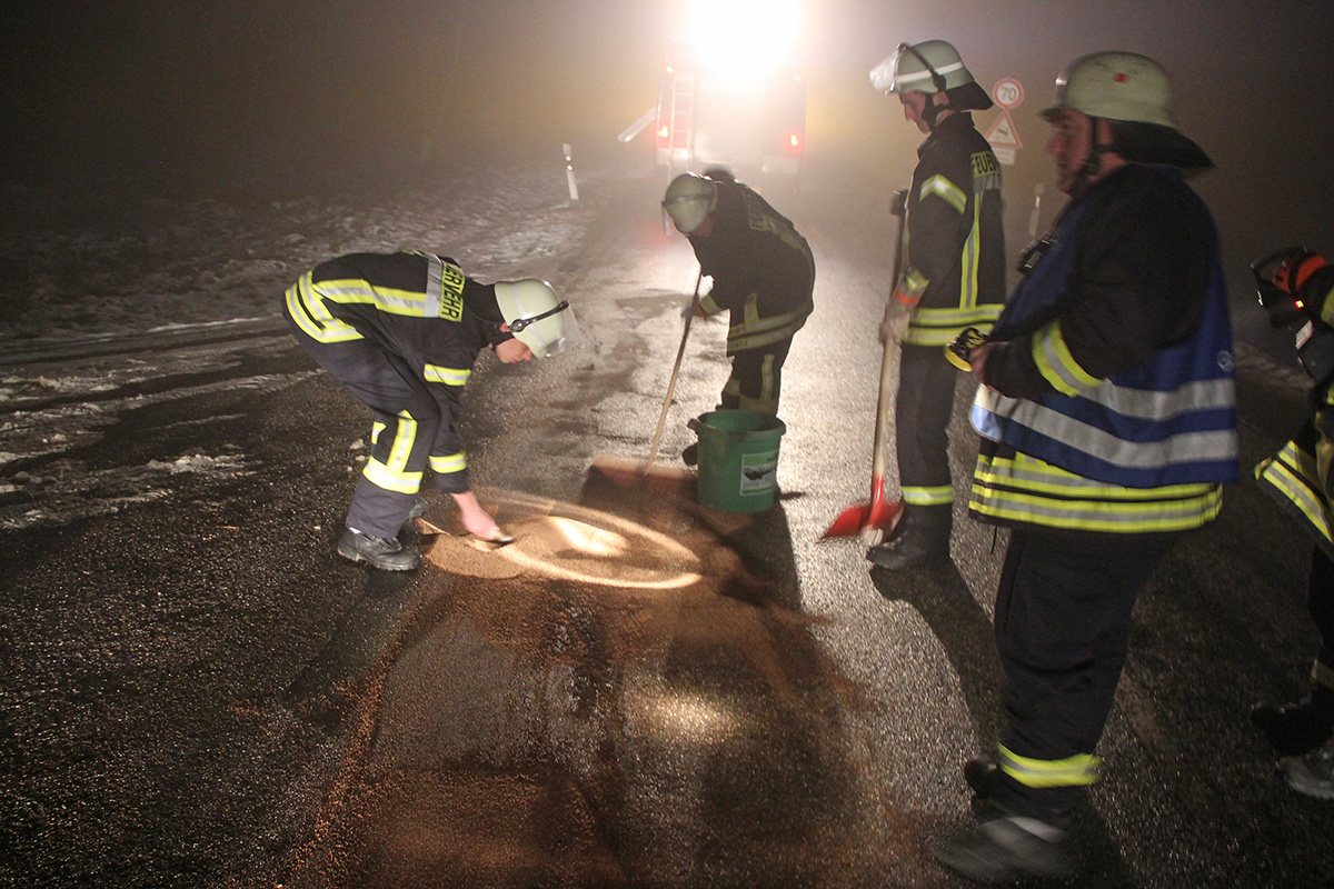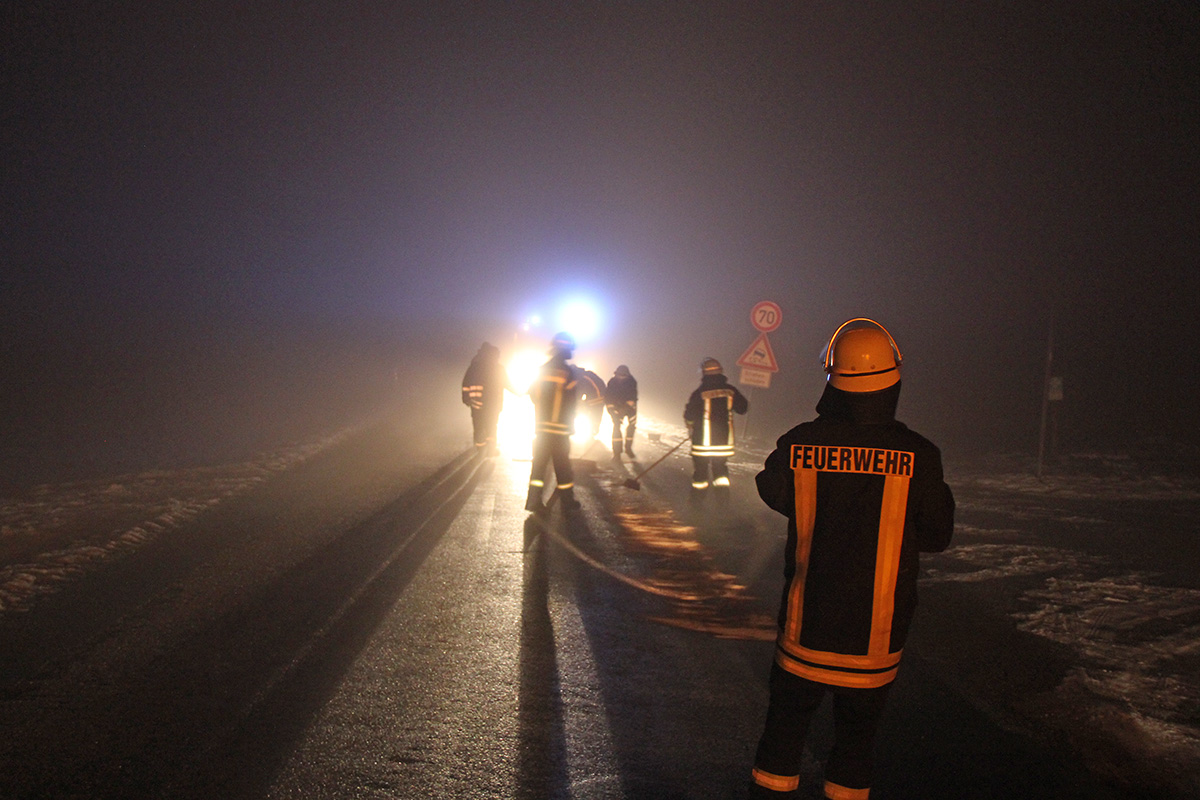 Zu einer Ölspur wurde der Löschbezirk Dirmingen am Abend 23. Januar 2016 alarmiert. Ein aufmerksamer Autofahrer hatte beim Abbiegen von der L303 auf den Waldparkplatz zwischen Dirmingen und Tholey den Ölfilm auf der Straße bemerkt und die Polizei informiert. Auf rund 10 Metern Länge fanden die Einsatzkräfte eine dicke Ölspur vor. Mit Bindemitteln wurde die gefährliche Stelle abgetreut und die Einsatzstelle an die Polizei übergeben. Der Verursacher der Ölspur ist unbekannt. Der Löschbezirk Dirmingen war mit zwei Fahrzeugen und 18 Kräften im Einsatz.