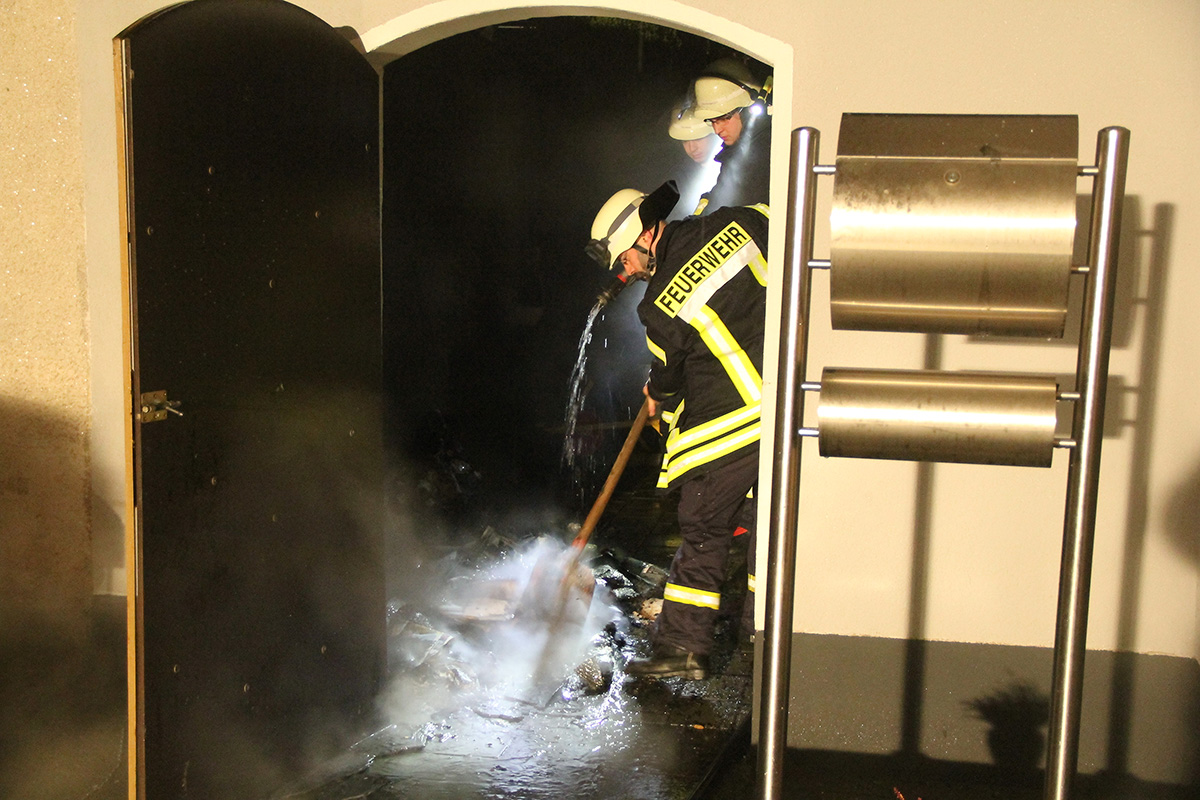Mit einem C-Rohr und unter Atemschutz konnte der Brand von den Einsatzkräften aus dem Löschbezirk Bubach-Calmesweiler schnell gelöscht werden. Der Brandschutt musste mehrfach nach versteckten Glutnestern durchsucht und abgelöscht werden. Die drei Mülltonnen wurden bei dem Brand vollständig zerstört.