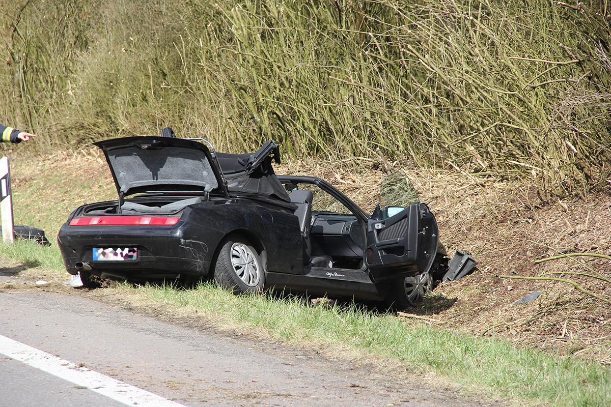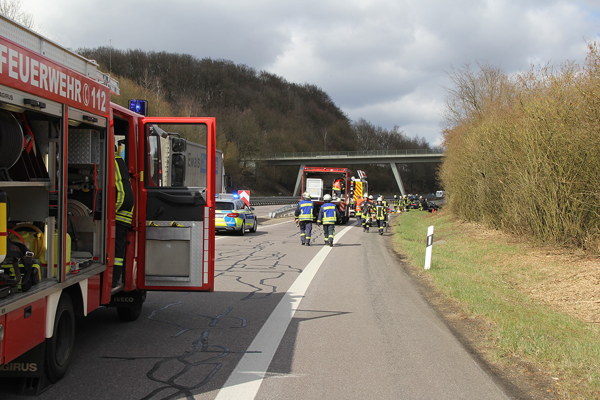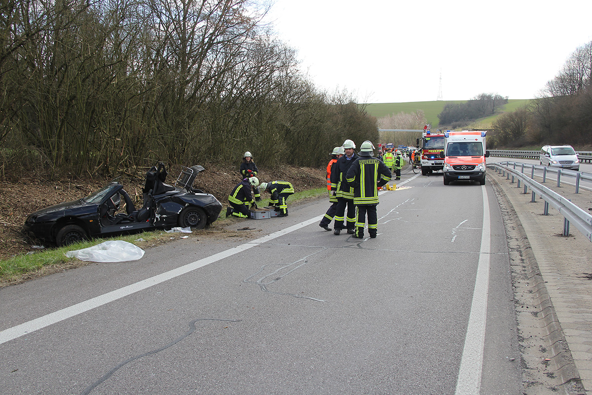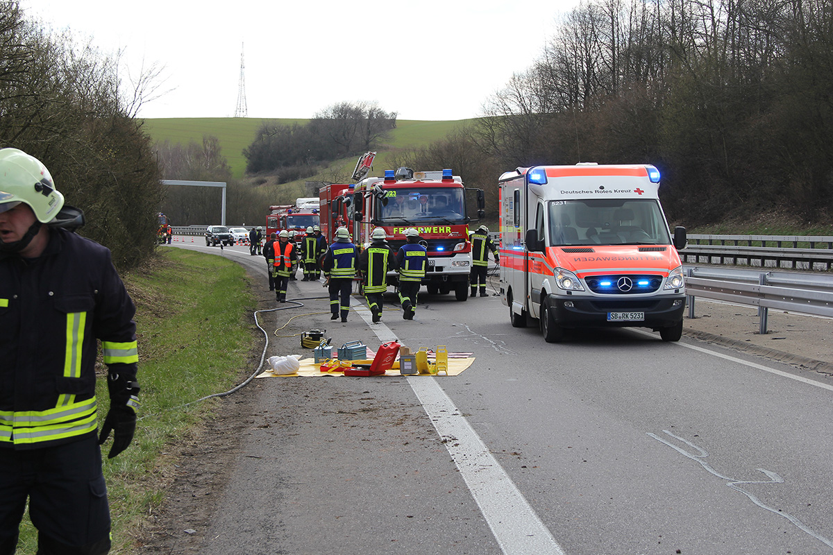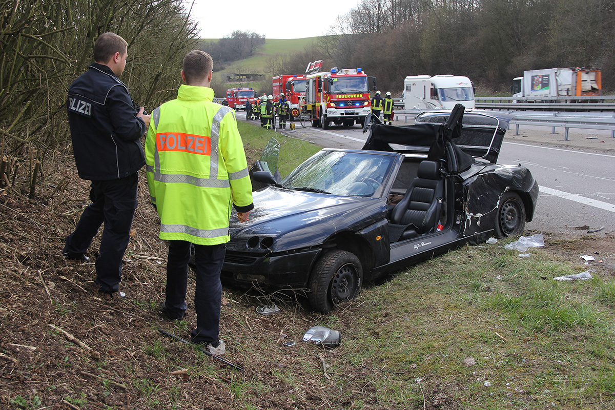 Zu einem schweren Verkehrsunfall kam es am Nachmittag des 22. März 2016 auf der Autobahn A1 zwischen den Anschlussstellen Eppelborn und Tholey in Fahrtrichtung Trier. Ein 52-jähriger Mann verlor in Höhe der Aufsplittung der dreispurigen Autobahn die Kontrolle über den Alfa Romeo, kam ins Schleudern und kollidierte mehrfach mit den Leitplanken.