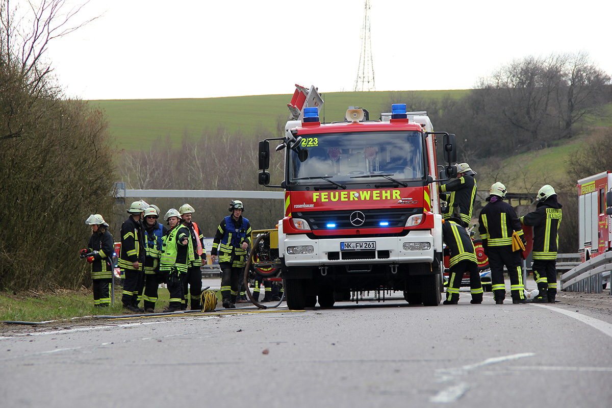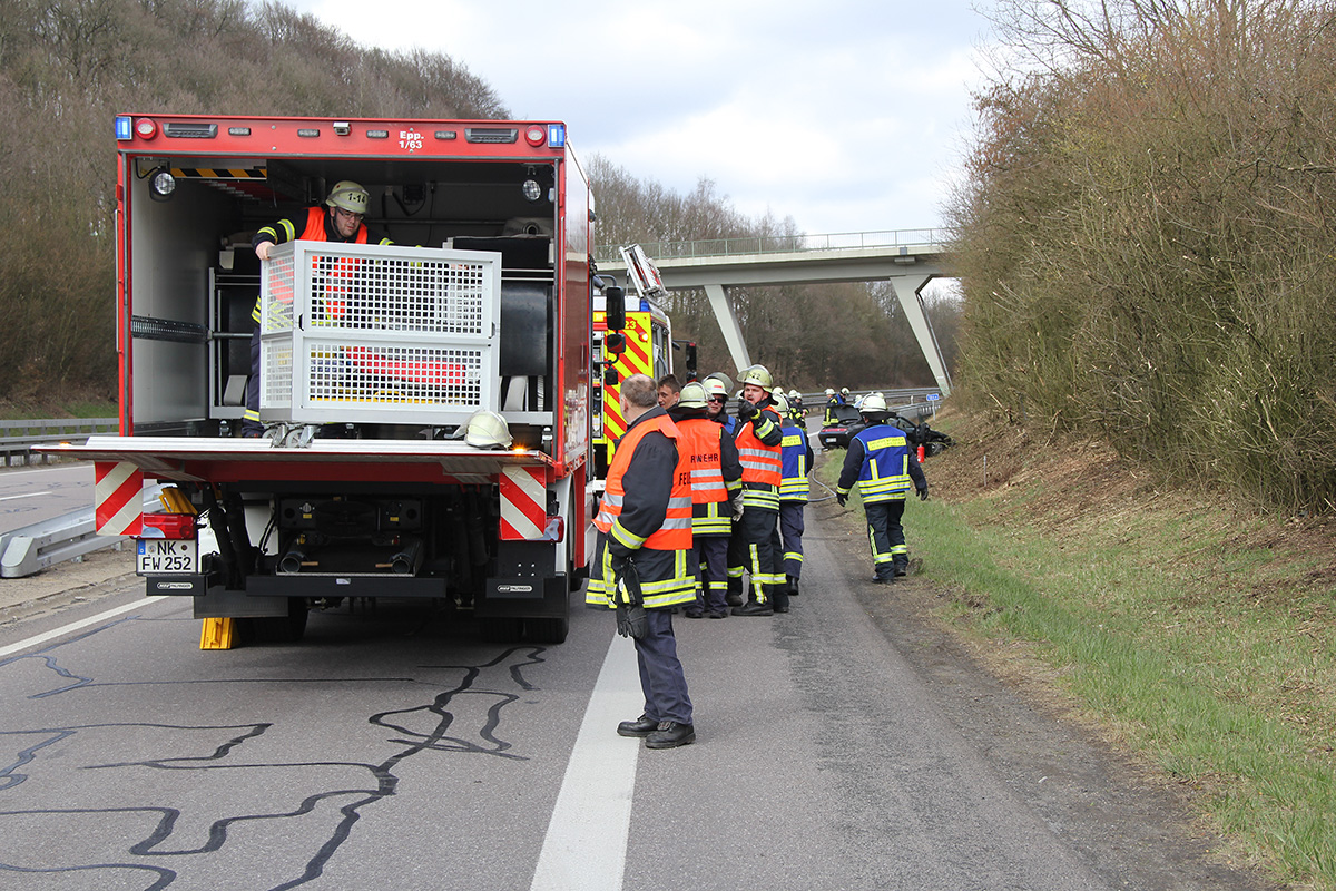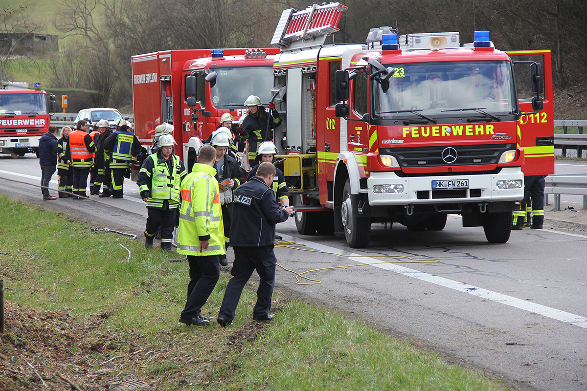 Erste Anrufer berichteten, dass der Mann in seinem Fahrzeug eingeklemmt ist und dass der Wagen in Brand geraten wäre. Neben Polizei und Rettungsdienst wurden deshalb auch die Feuerwehren aus Eppelborn, Bubach-Calmesweiler und Hierscheid sowie die Feuerwehr aus Uchtelfangen zur technischen Rettung alarmiert. Noch auf der Anfahrt entspannte sich die Lage etwas, da weitere Anrufer einen Brand des Unfallfahrzeugs nicht bestätigen konnten.